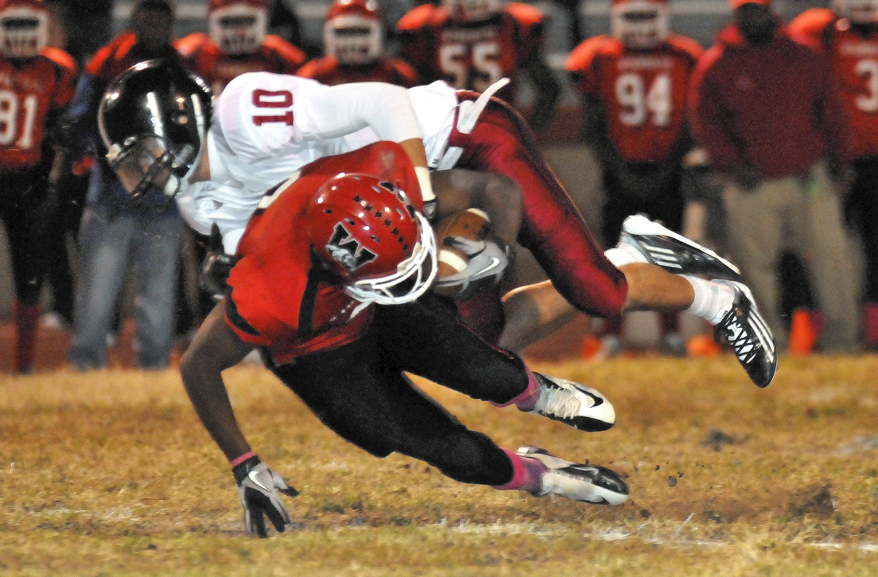 Lawrence High's Isaiah Boldridge (10) lays a big hit on Wyandotte's Xavier McKinzy on Friday, Oct. 19, 2012, in Kansas City, Kan.
