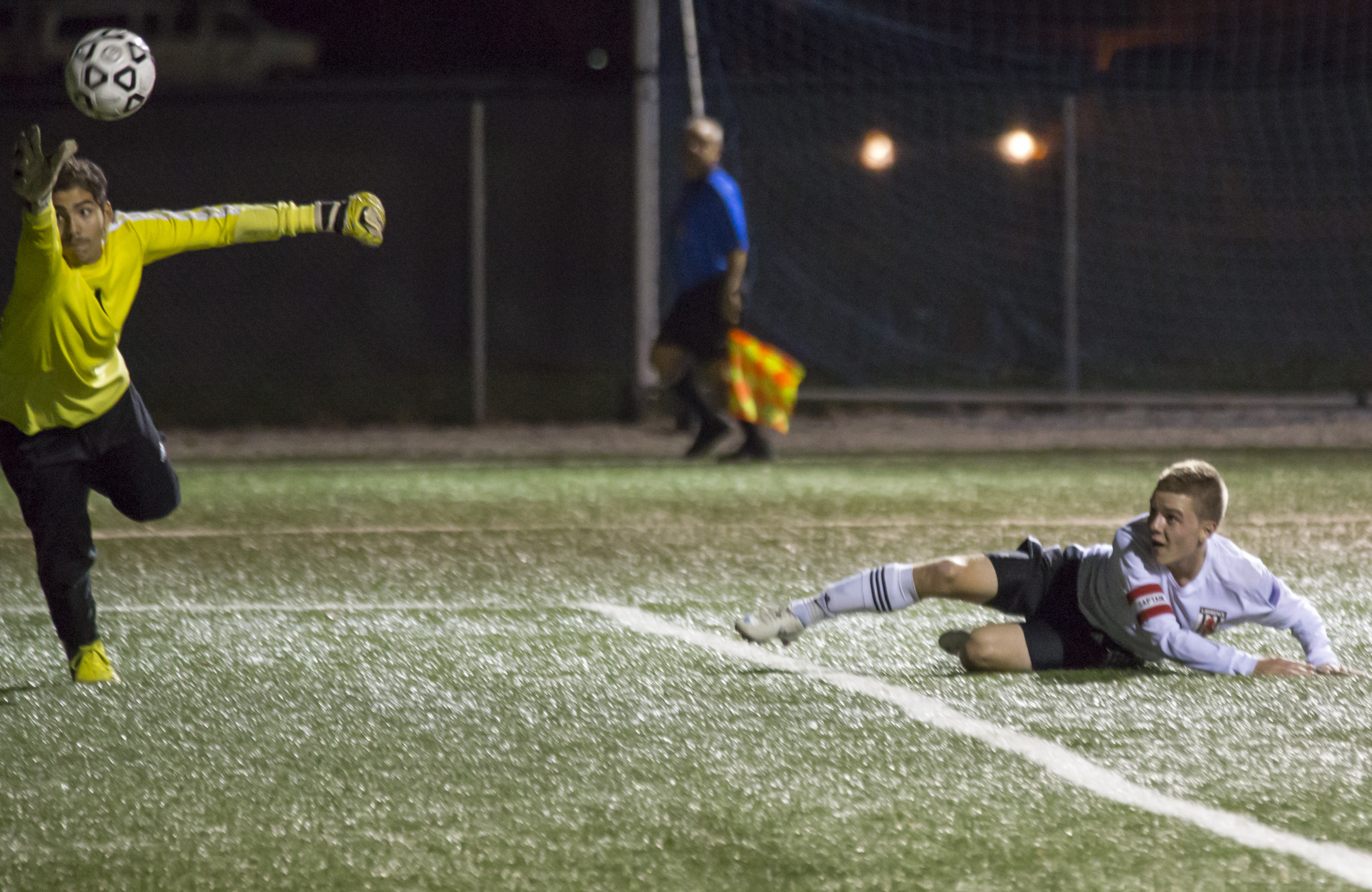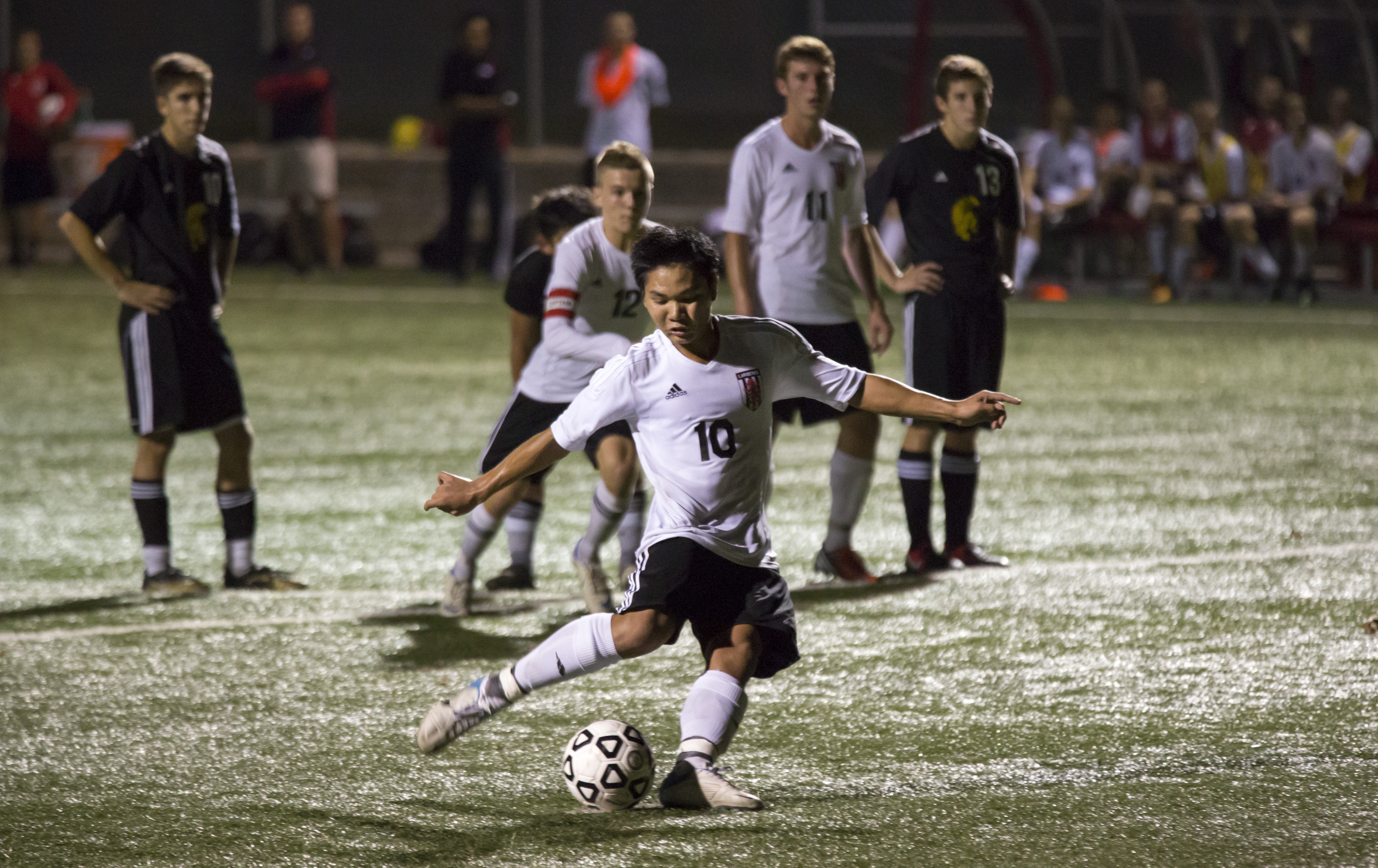 Lawrence High midfielder Johannes Reiber, right, watches his kick sail past the outstretched arm of Topeka High goalkeeper James Lucatero and into the net for a goal during their match, Tuesday, Oct. 23, 2012 at LHS.
