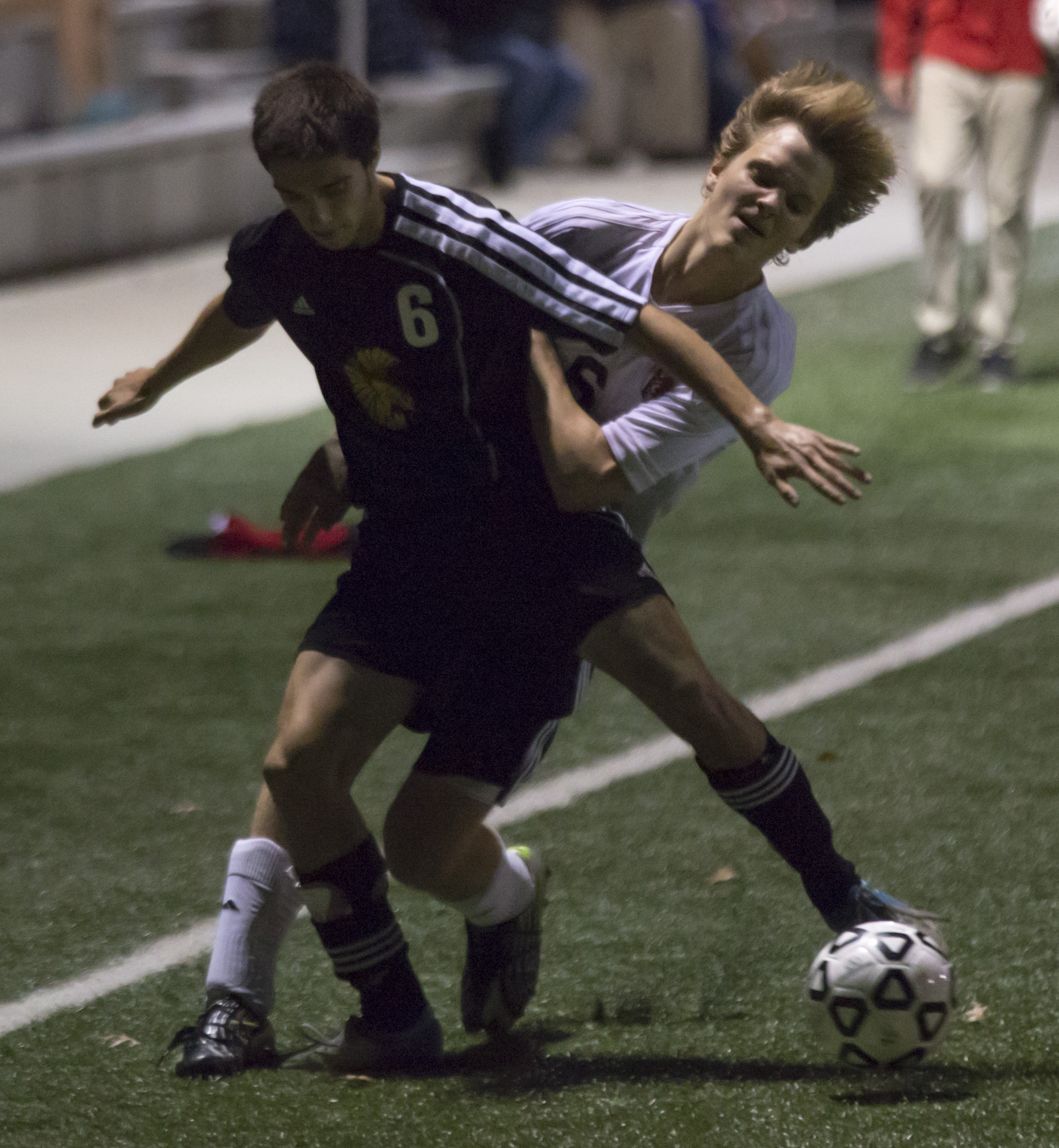 Topeka High defender Sam Nobo, front, uses his body to prevent Lawrence High forward Luke Matthews from getting to the ball during their match, Tuesday, Oct. 23, 2012 at LHS.
