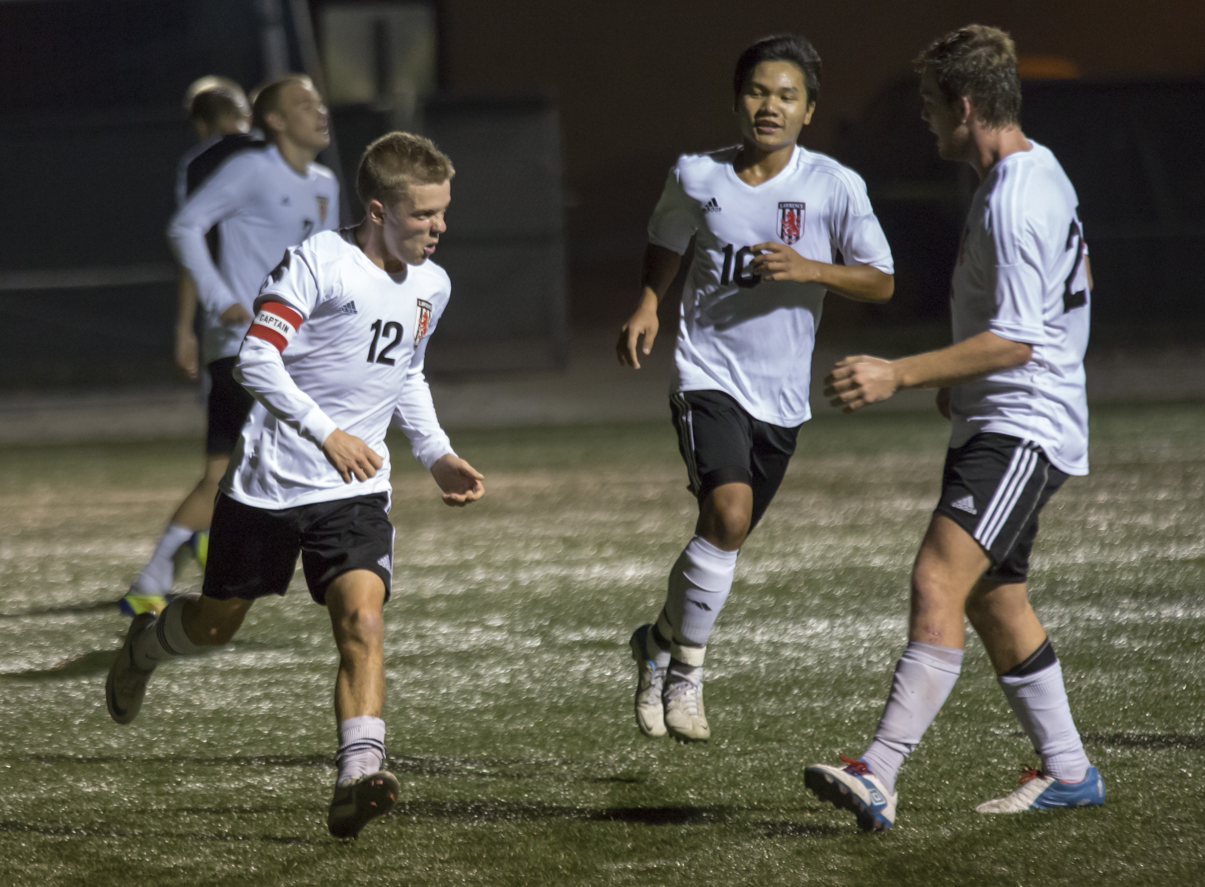 Lawrence High midfielder Johannes Reiber (12) celebrates his goal with teammates during their match against Topeka High, Tuesday, Oct. 23, 2012 at LHS.