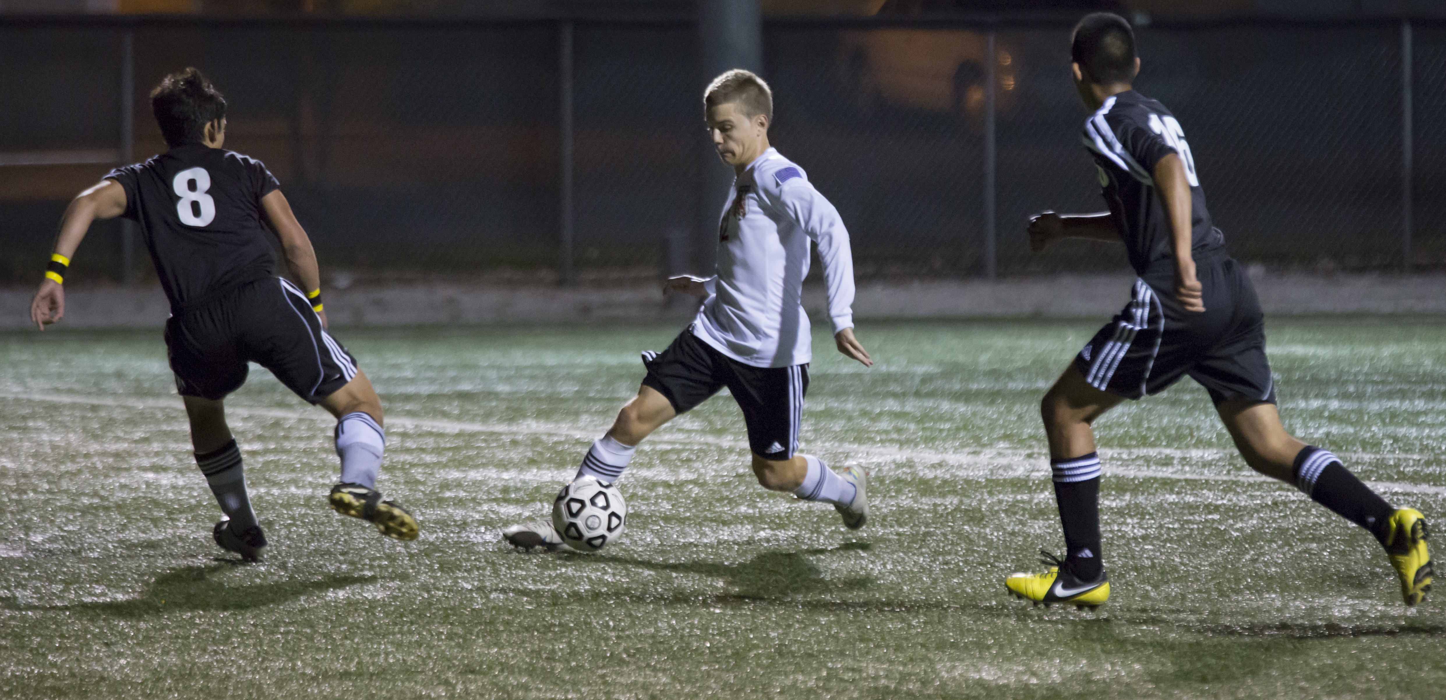 Lawrence High midfielder Johannes Reiber, center, maneuvers between Topeka High defenders Cooper Self (8) and Edgar Cervantes during their match, Tuesday, Oct. 23, 2012 at LHS.