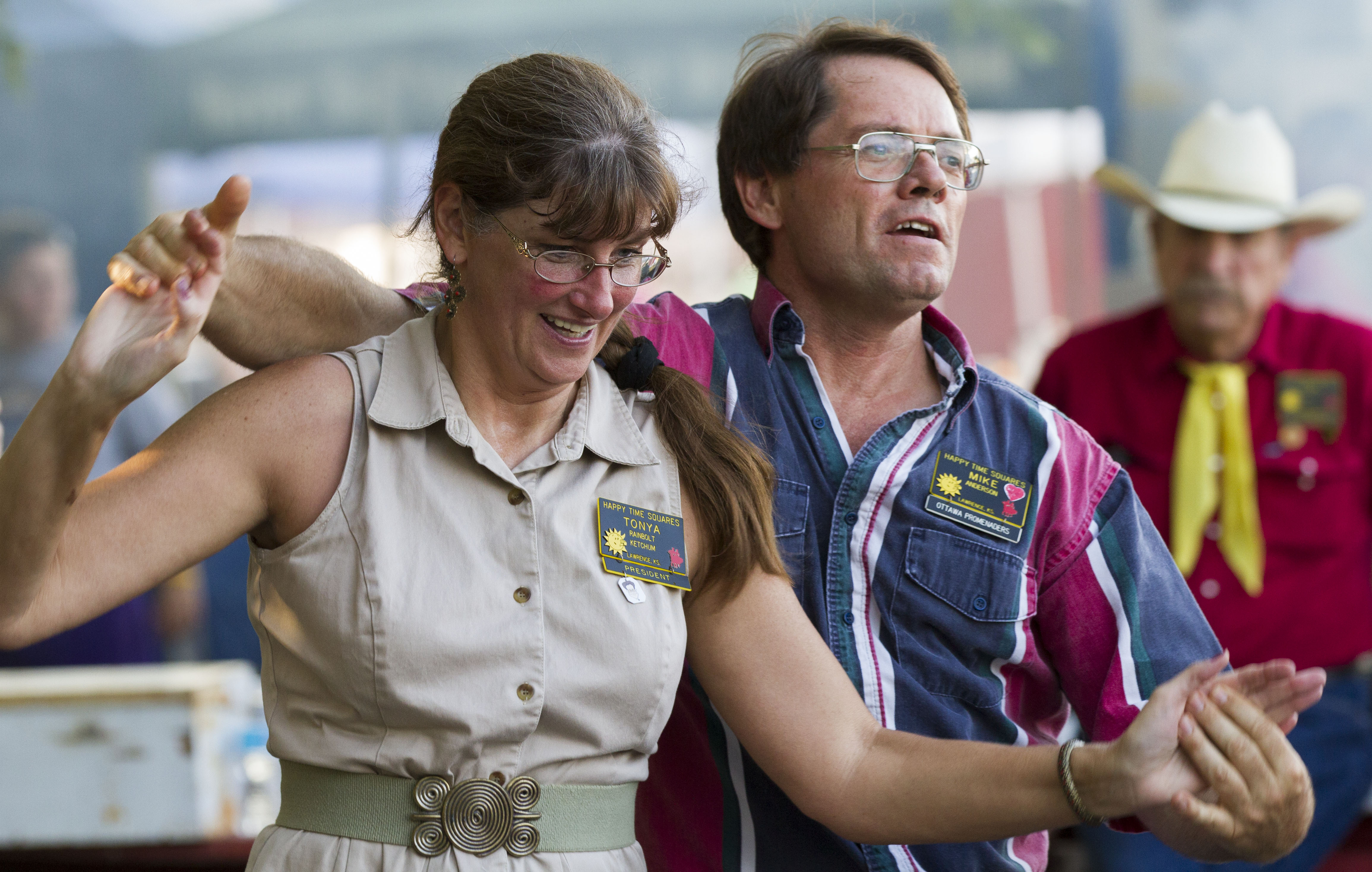 Tonya Ketchum, Lawrence, and Mike Anderson, Ottawa, participate in a square dance exhibition performed by the Lawrence based square dance group Happy Time Squares, Thursday, Aug. 1, 2013, at the Douglas County Fairgrounds during the annual free fair.