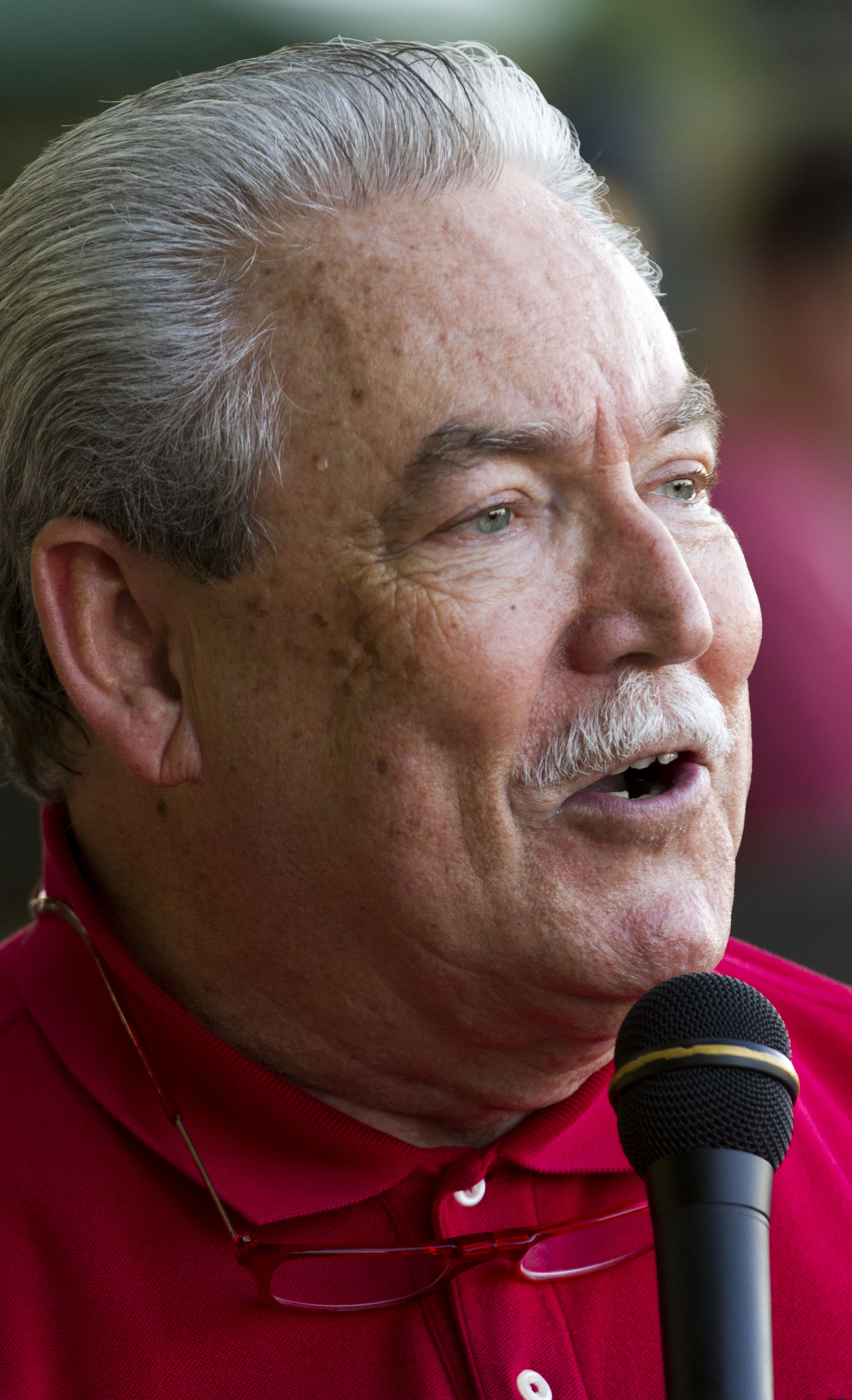 Vic Perry calls out various square dance calls during a square dance exhibition performed by the Lawrence based square dance group Happy Time Squares, Thursday, Aug. 1, 2013, at the Douglas County Fairgrounds during the annual free fair.