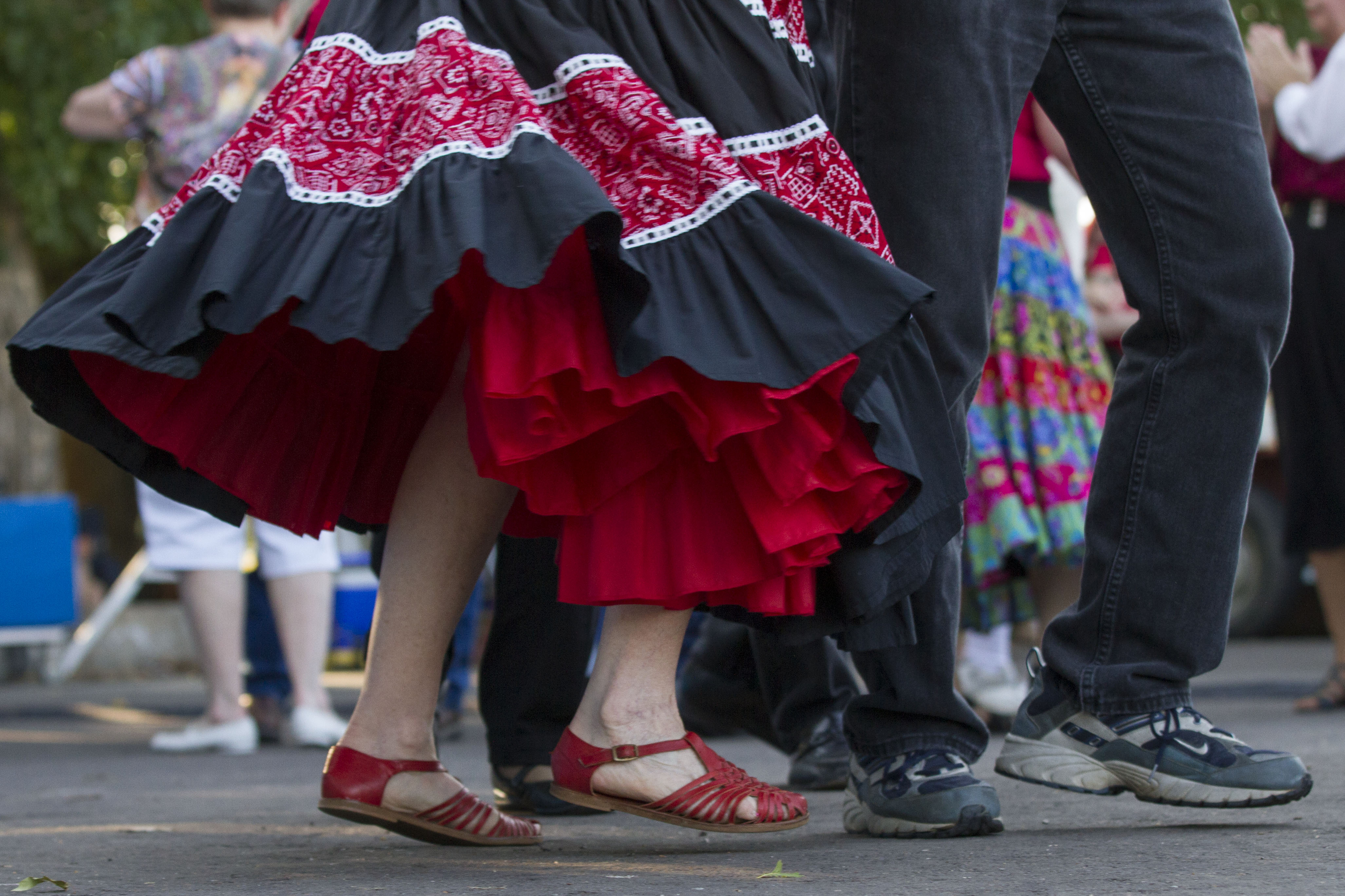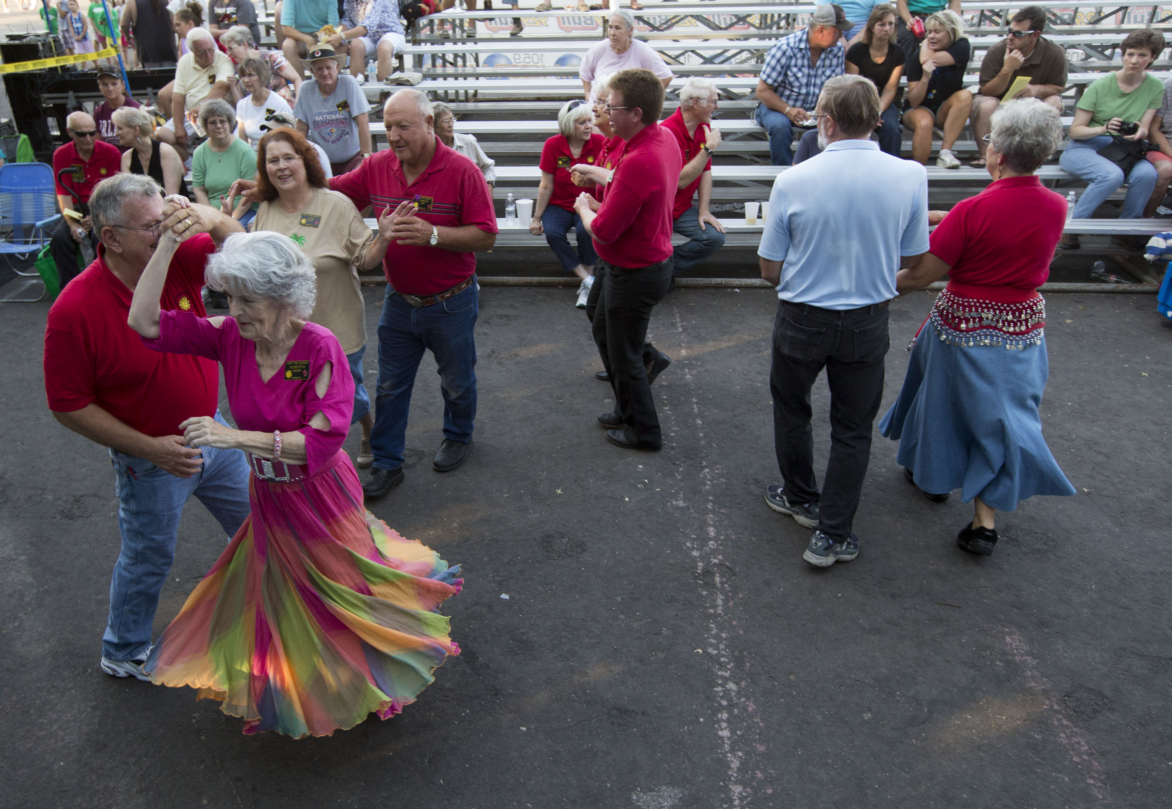 Dresses twirl and feet stomp during a square dance exhibition performed by the Lawrence based square dance group Happy Time Squares, Thursday, Aug. 1, 201,3 at the Douglas County Fairgrounds during the annual free fair.