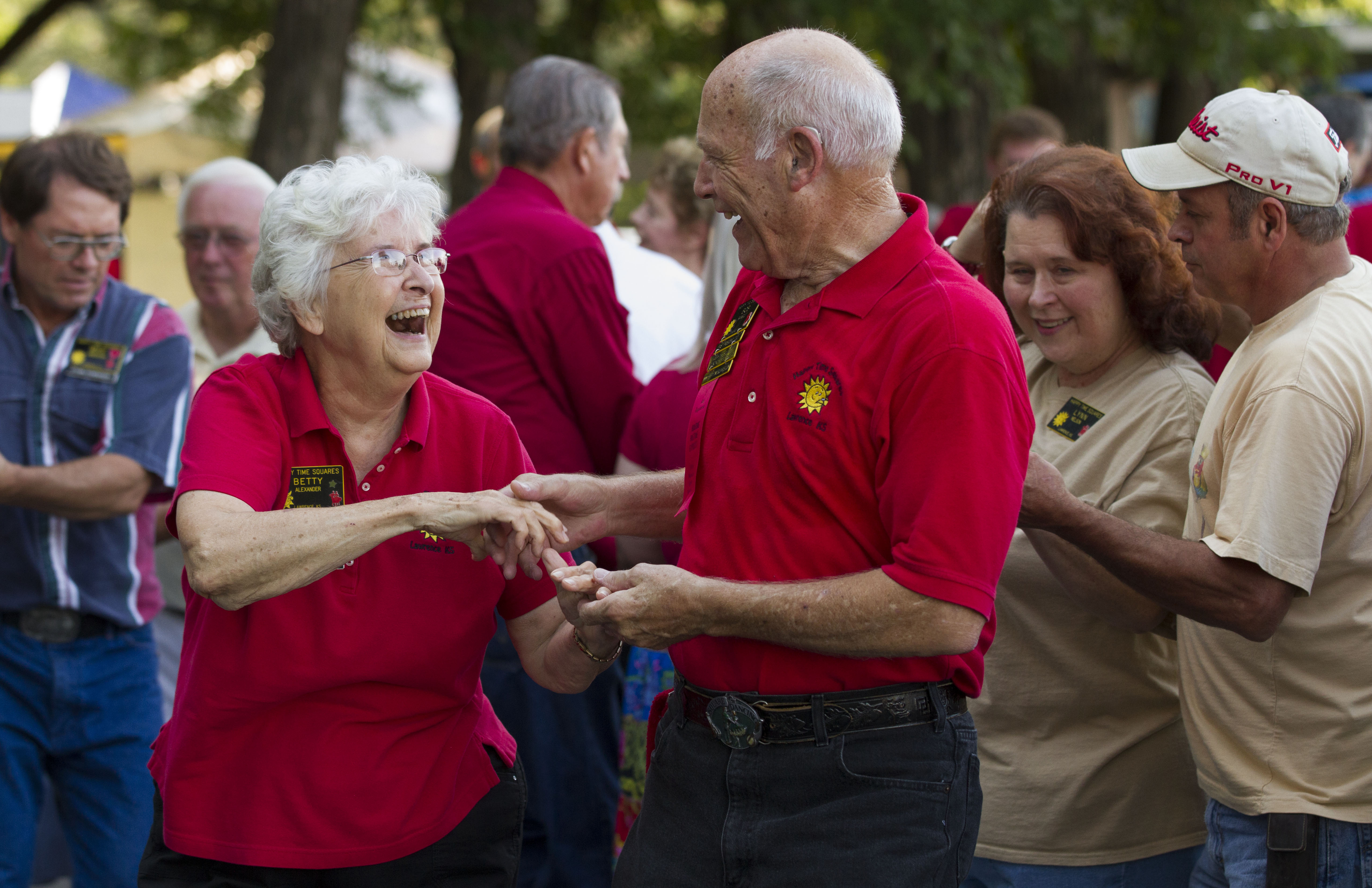 Betty Alexander and Bob Rainbolt share a smile and a laugh during a square dance exhibition performed by the Lawrence based square dance group Happy Time Squares, Thursday, Aug. 1, 2013, at the Douglas County Fairgrounds during the annual free fair.