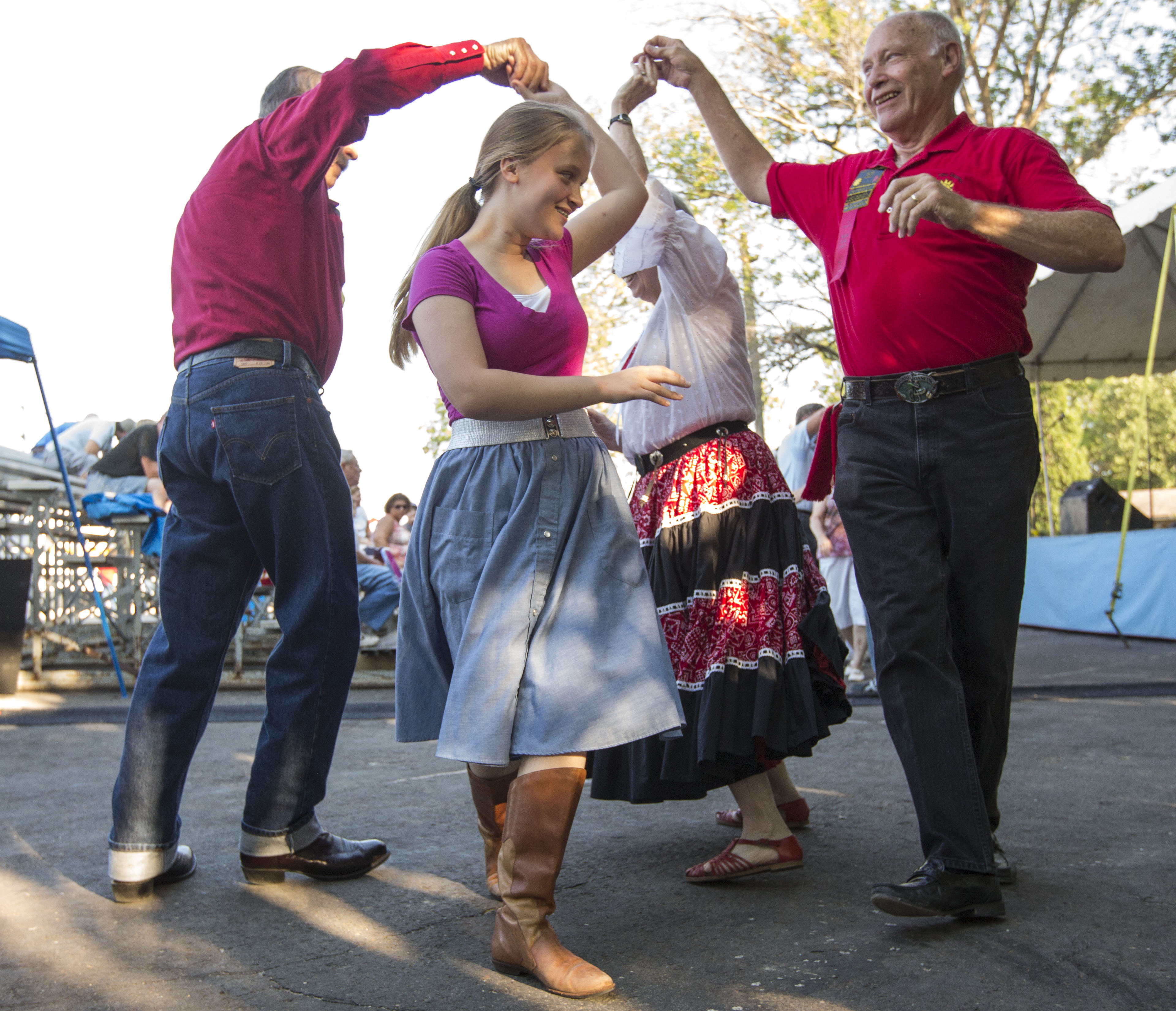 Lydia Morrow, 13, Lawrence, twirls as she performs a square dance exhibition with the Lawrence based square dance group Happy Time Squares, Thursday, Aug. 1, 2013, at the Douglas County Fairgrounds during the annual free fair.
