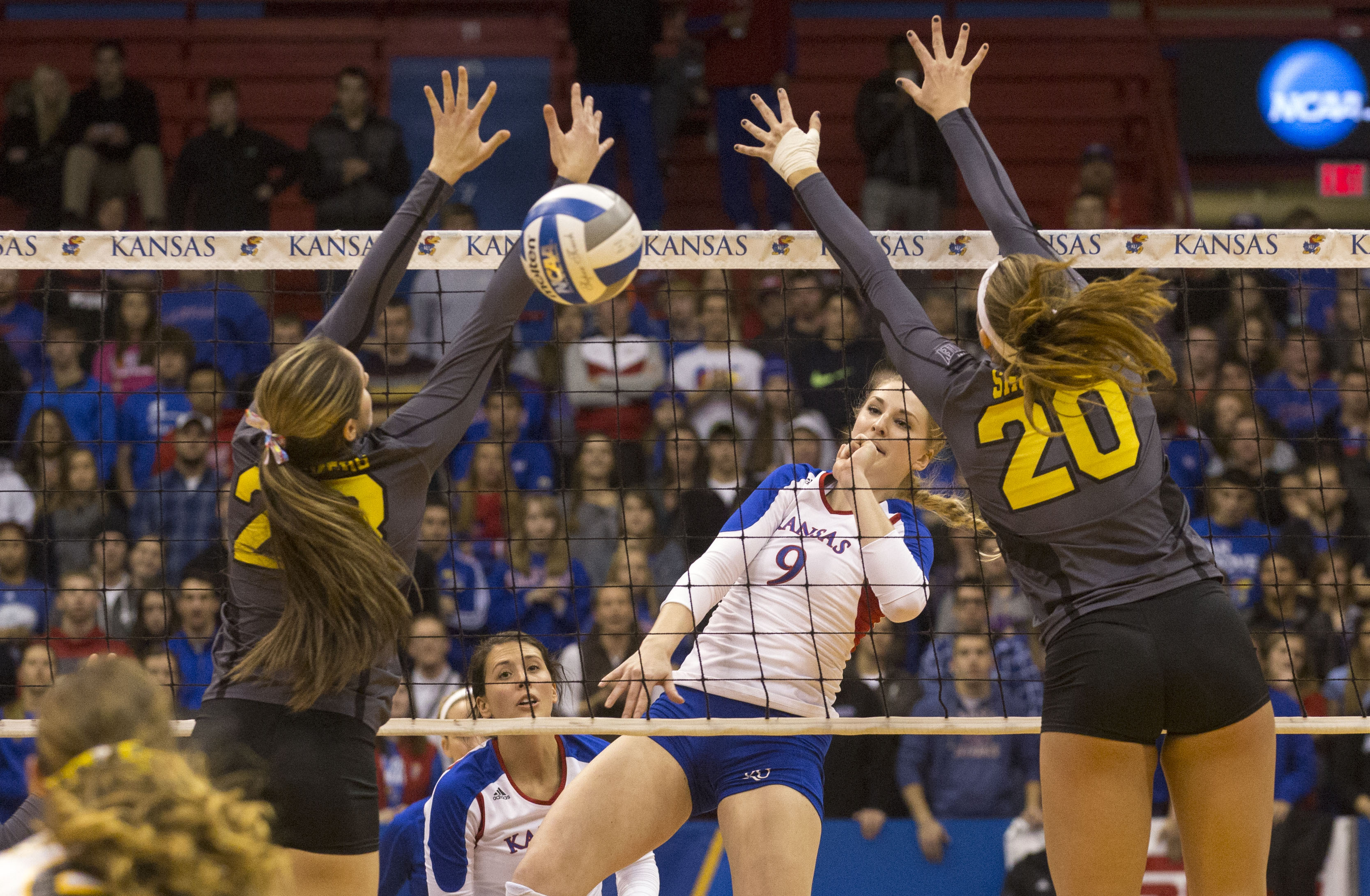 Kansas' Caroline Jarmoc (9) blasts the ball between Wichita State's Ashley Andrade (28) and Sam Sanders (20) during their volleyball match in the first round of the NCAA tournament at Allen Fieldhouse. The Jayhawks defeated the Shockers, 3-1, and will face Creighton Saturday at 6:30 p.m.
