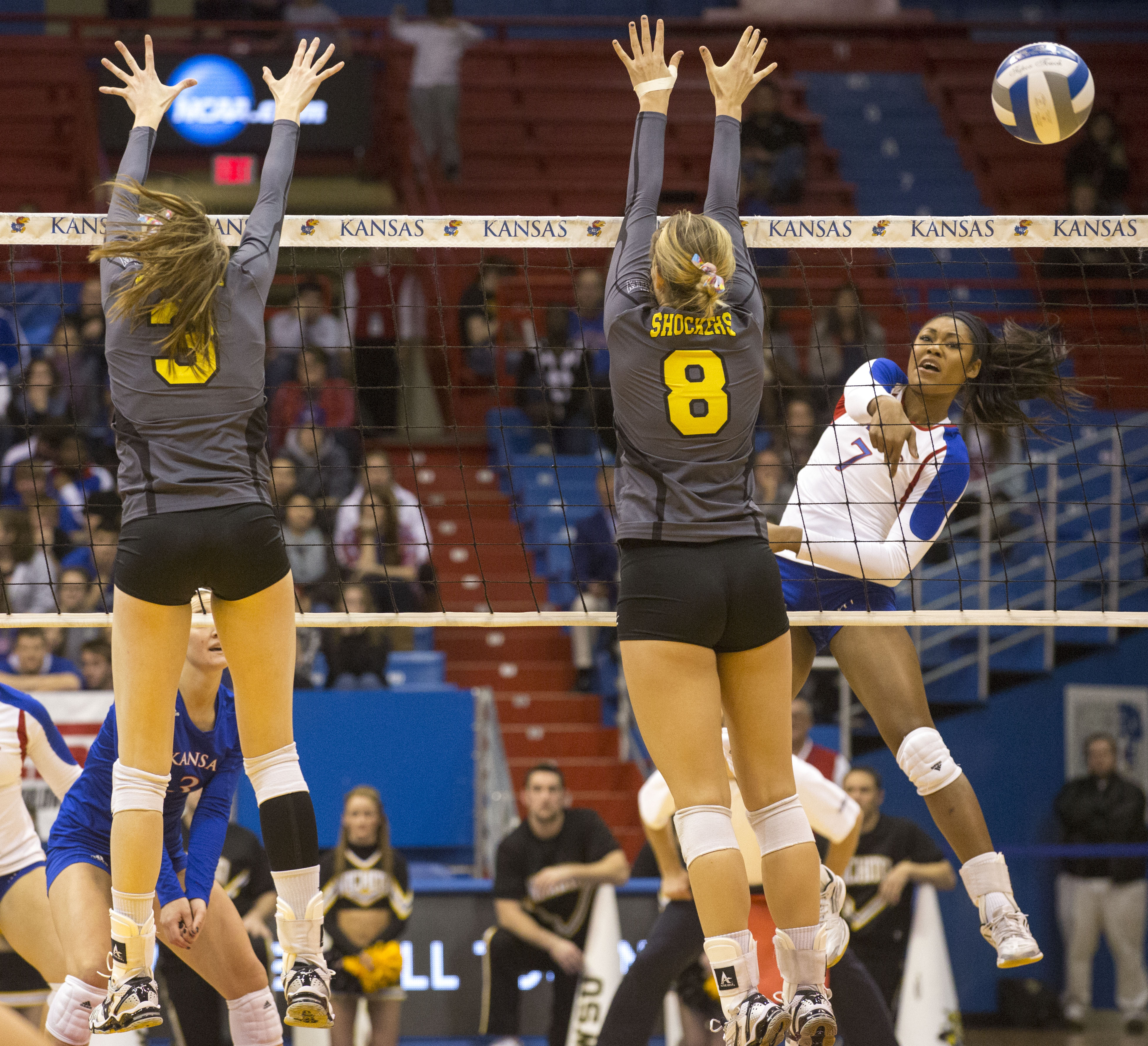 Kansas' Sara McClinton (4) spikes the ball past Elizabeth Field (3) and Chelsey Feekin (8) during their volleyball match in the first round of the NCAA tournament at Allen Fieldhouse. The Jayhawks defeated the Shockers, 3-1, and will face Creighton Saturday at 6:30 p.m.
