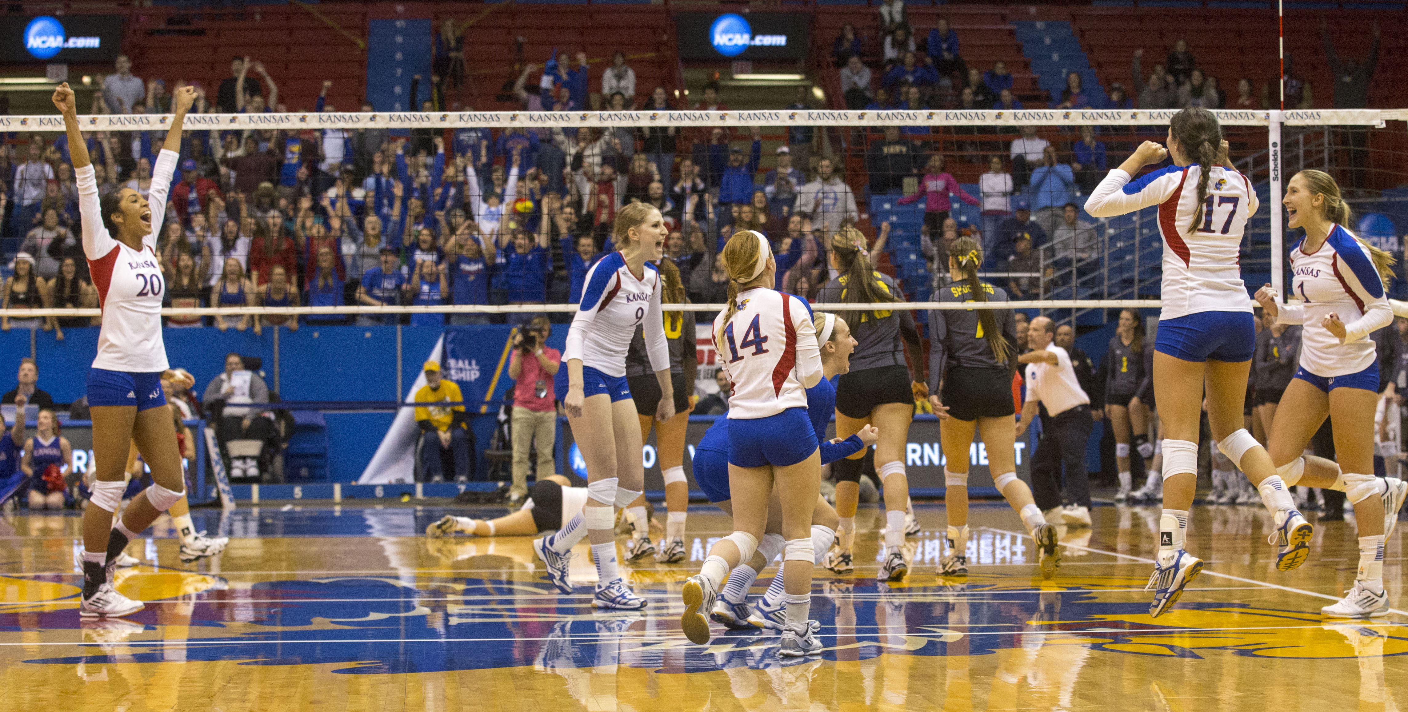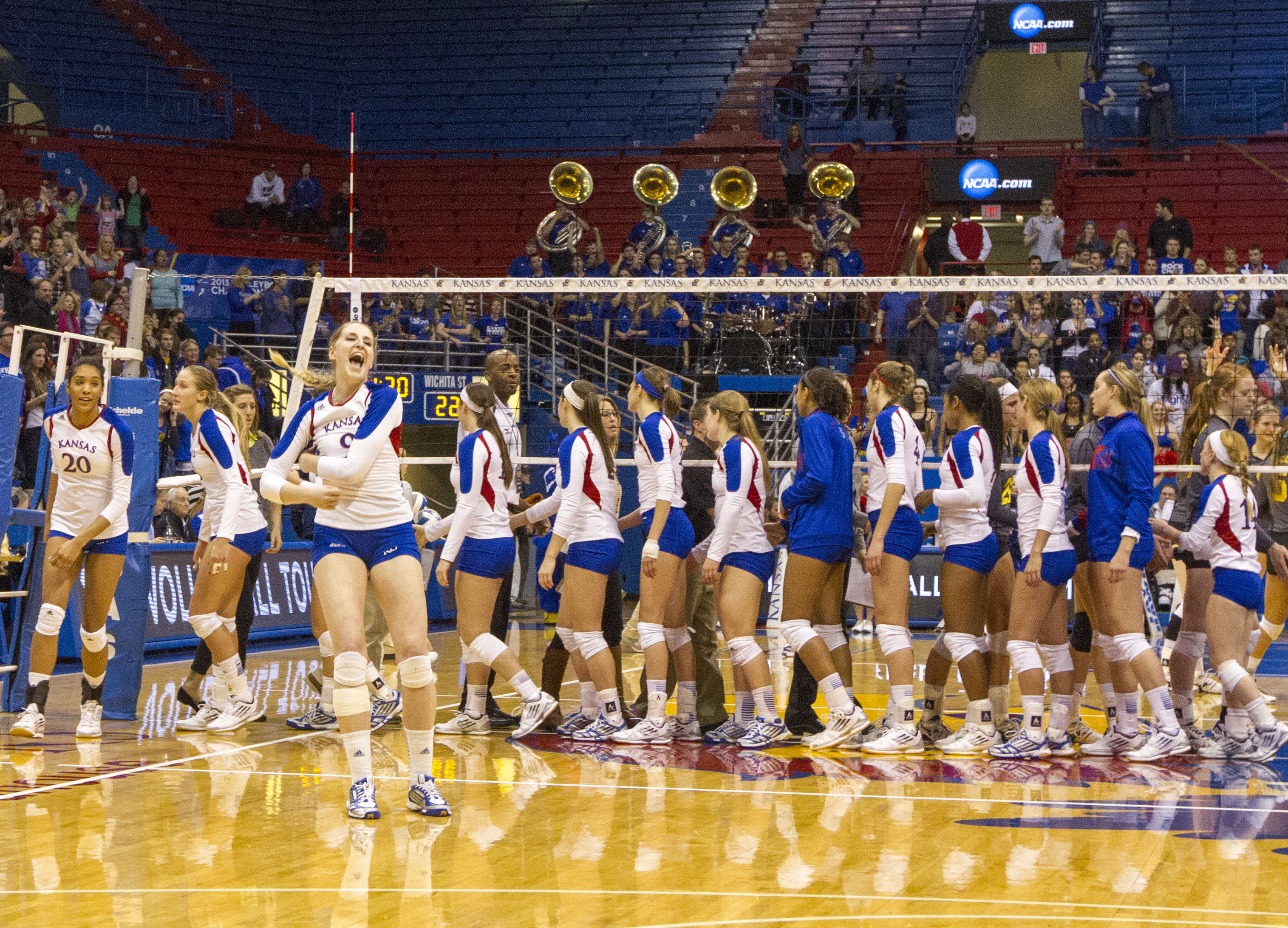 Kansas players celebrate after defeating Wichita State during their volleyball match in the first round of the NCAA tournament at Allen Fieldhouse. The Jayhawks will face Creighton Saturday at 6:30 p.m.
