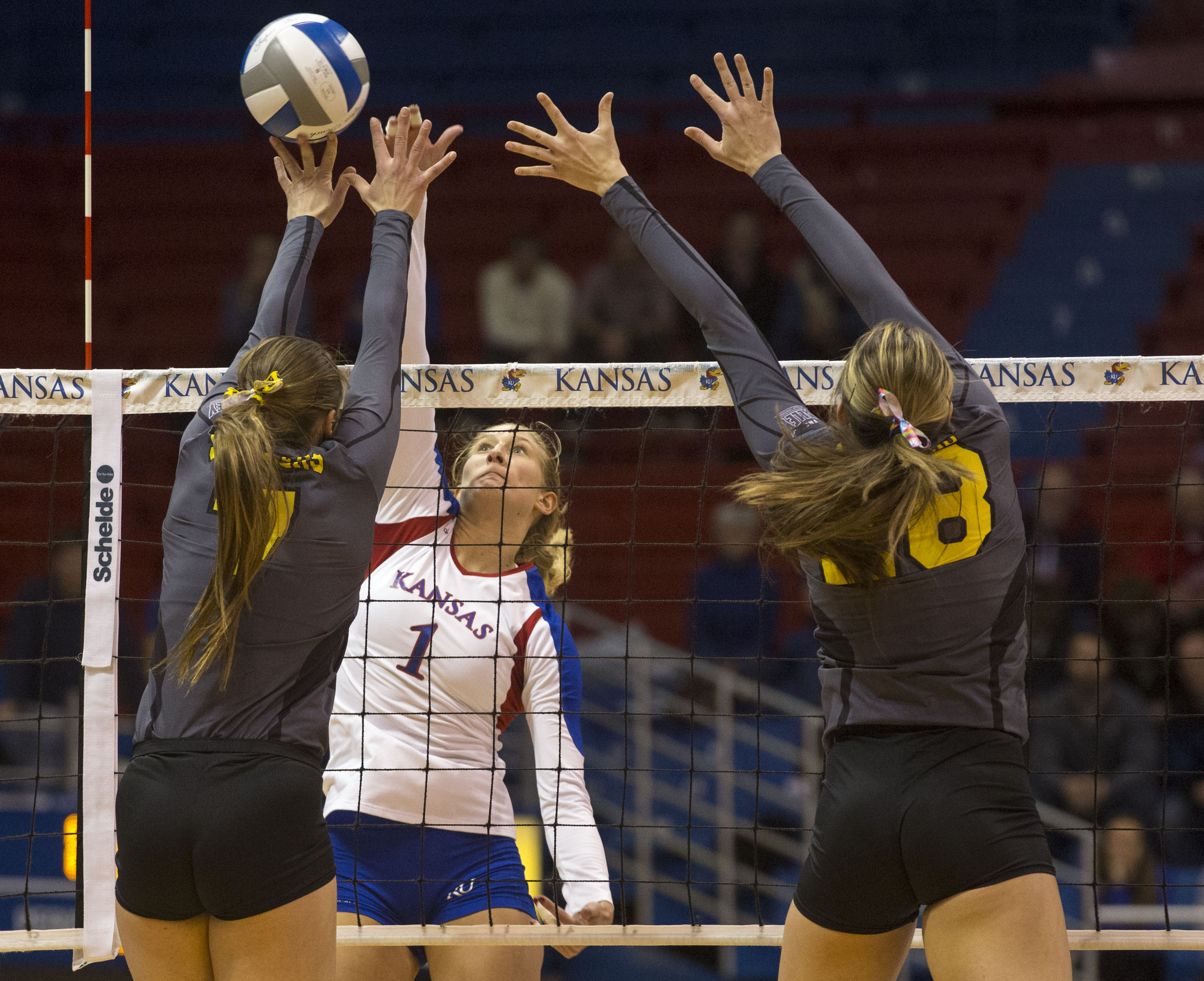 Kansas' Chelsea Albers (1) is challenged at the net by Wichita State's Ashley Andrade (28) and Katie Reilly (7) during their volleyball match in the first round of the NCAA tournament at Allen Fieldhouse. The Jayhawks defeated the Shockers, 3-1, and will face Creighton Saturday at 6:30 p.m.