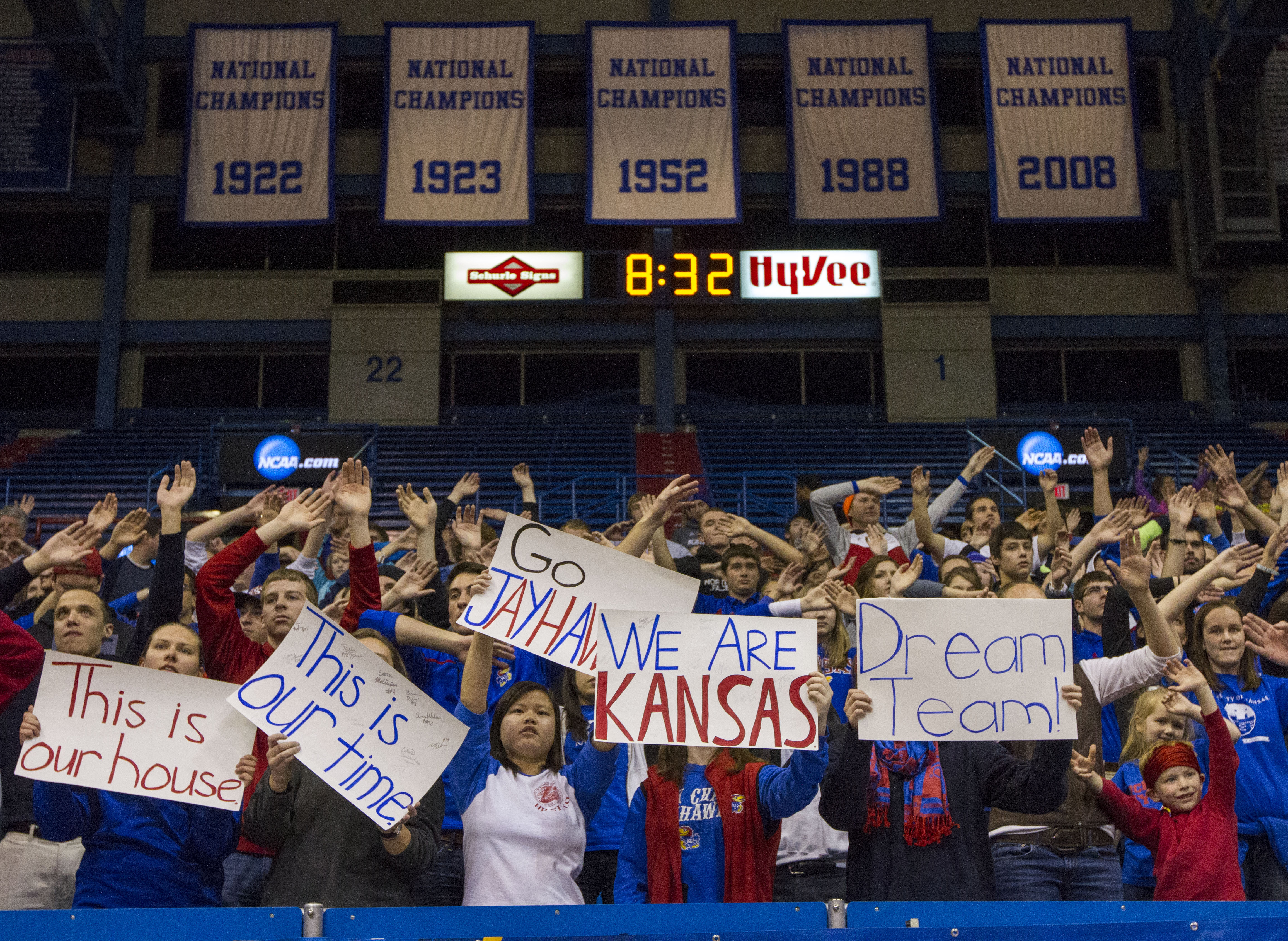 Kansas fans celebrate the Jayhawk' victory or Wichita State in the first round of the NCAA tournament at Allen Fieldhouse. The Jayhawks will face Creighton Saturday at 6:30 p.m.