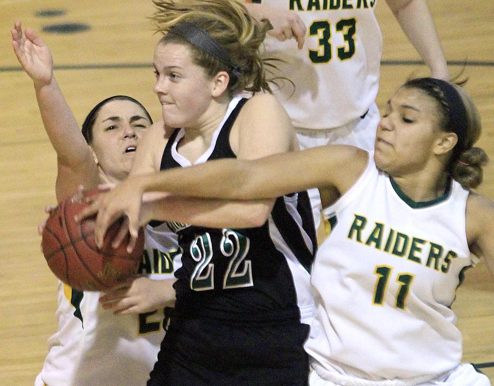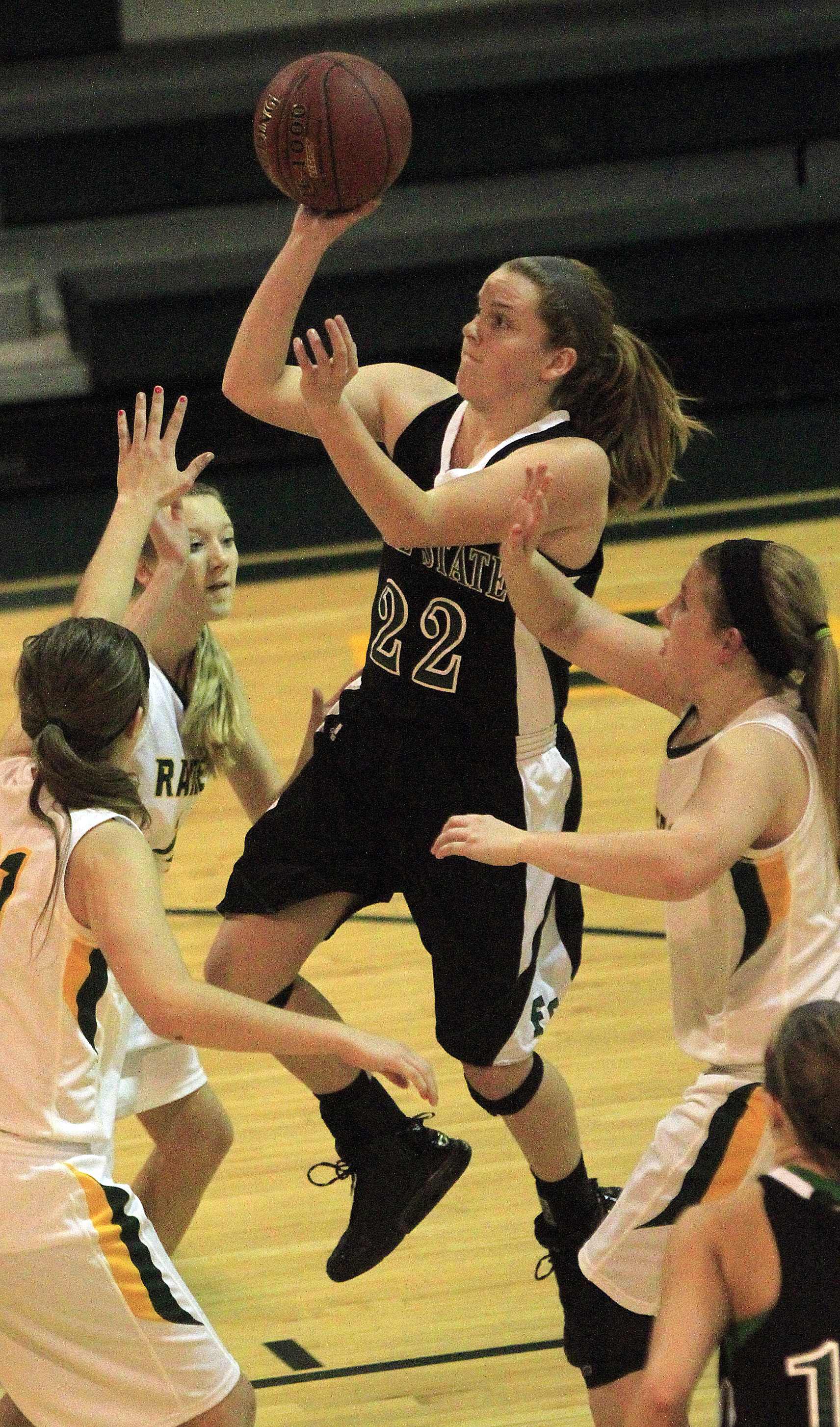 Free State’s Scout Wiebe (22) drives between Shawnee Mission South’s Shiya Pouncil, left, and Siera Roberts (11) in a 49-46 FSHS loss on Monday, Jan. 7, 2013, at SM South.