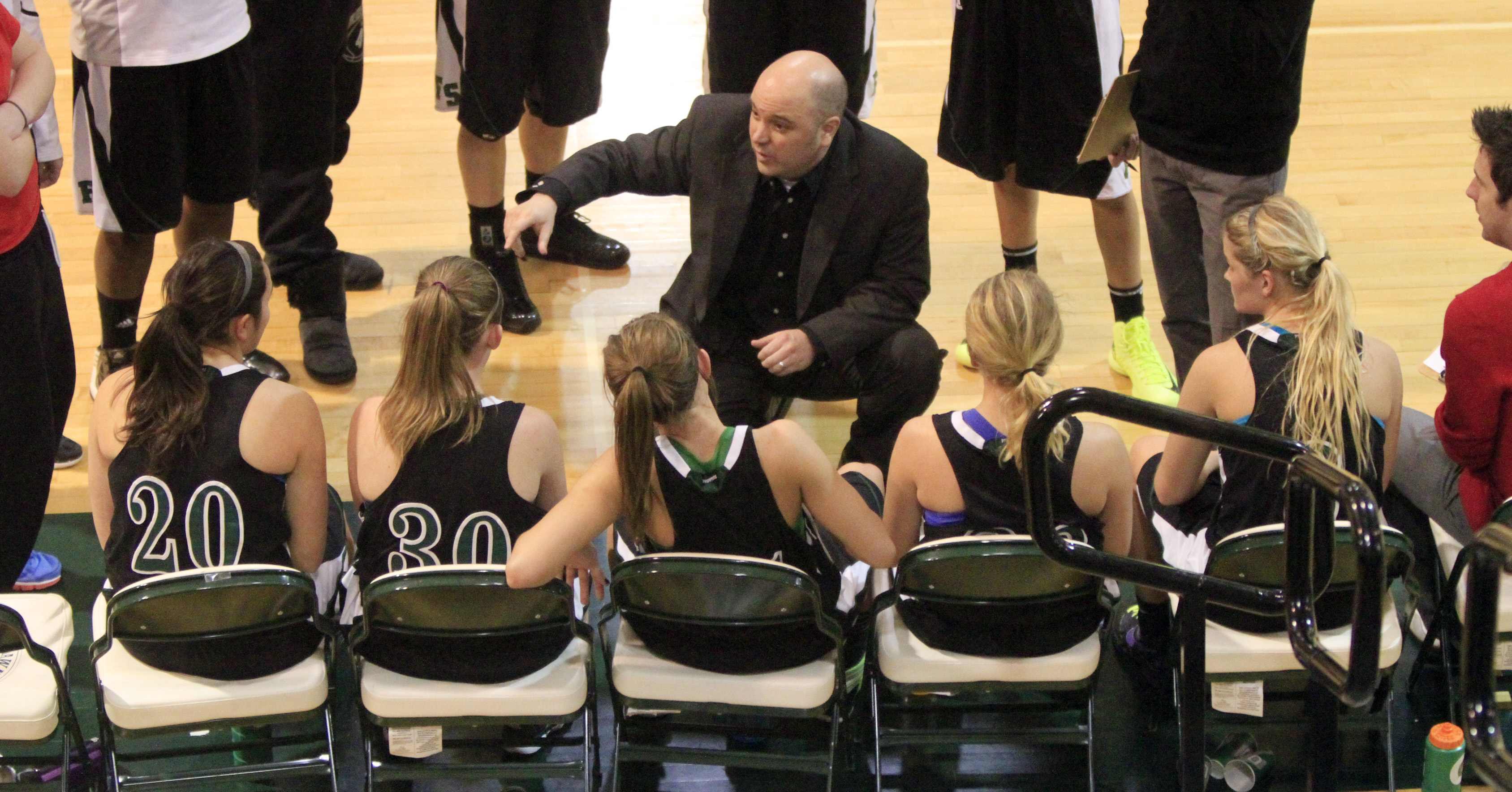 FSHS coach Bryan Duncan talks to the Firebirds trying to calm them down in the final minutes of a 49-46 loss Monday, Jan. 7, 2013, at Shawnee Mission South.