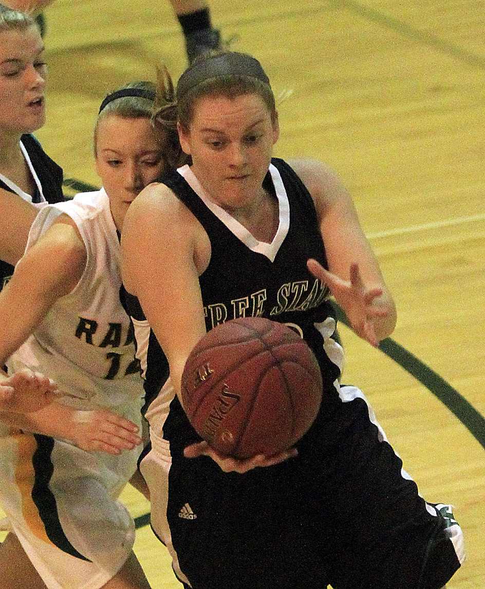 Free State's Scout Wiebe, front, takes a rebound from Shawnee Mission South's Chole Matthews on Monday, Jan. 7, 2013, at SM South.