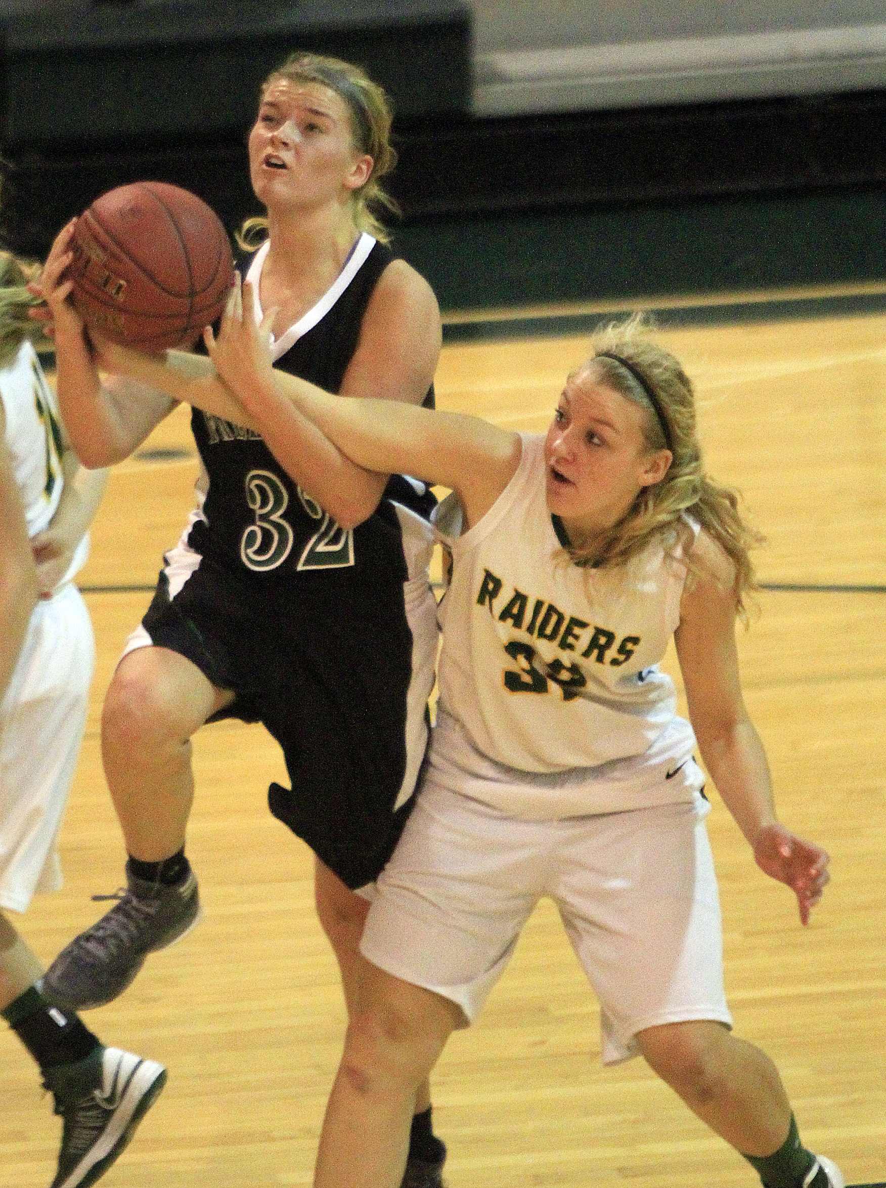 Free State senior Chelsea Casady (32) tries for a basket as Shawnee Mission South's Ashlie Fisher gets a hand in for a block on Monday, Jan. 7, 2013 at SM South.