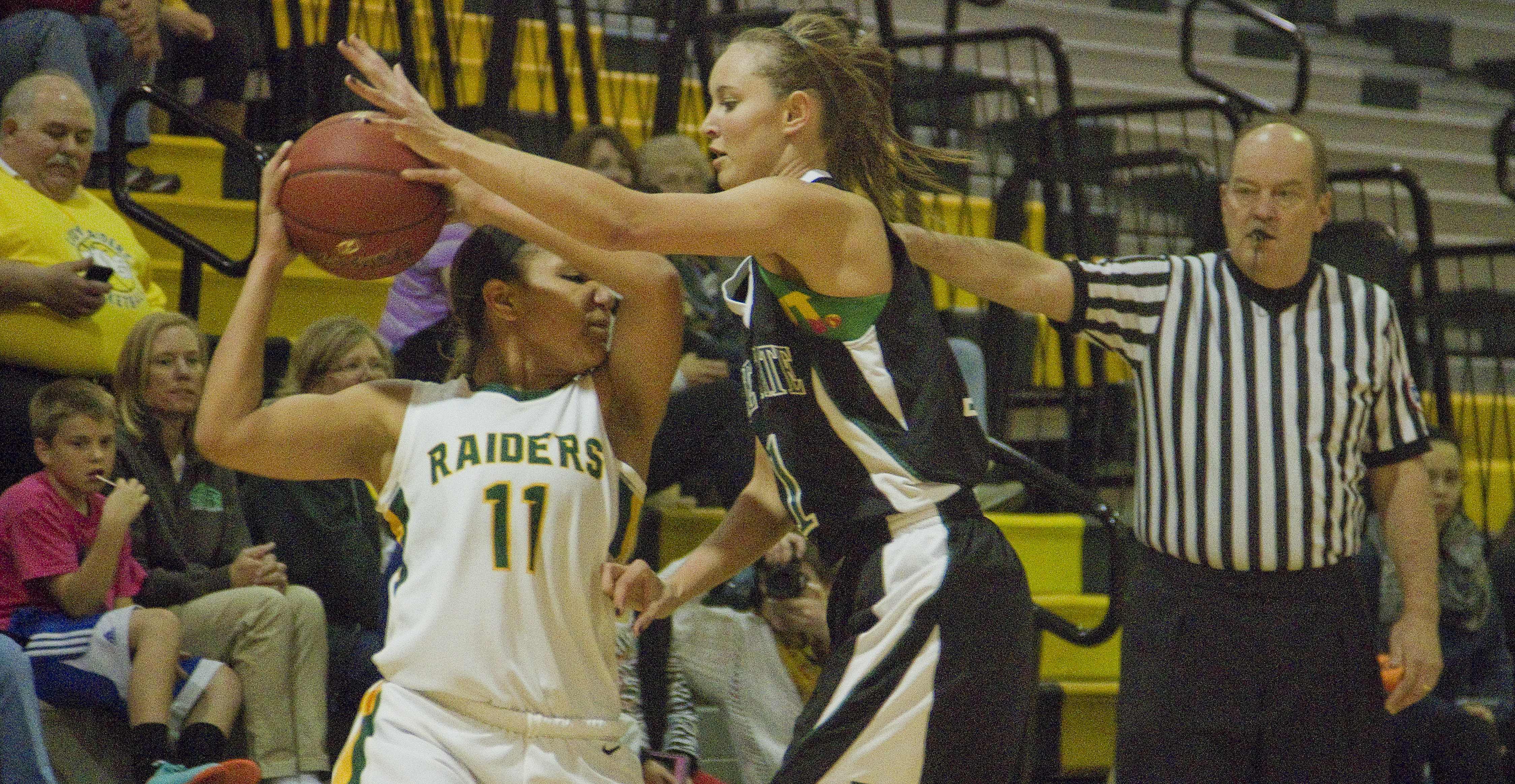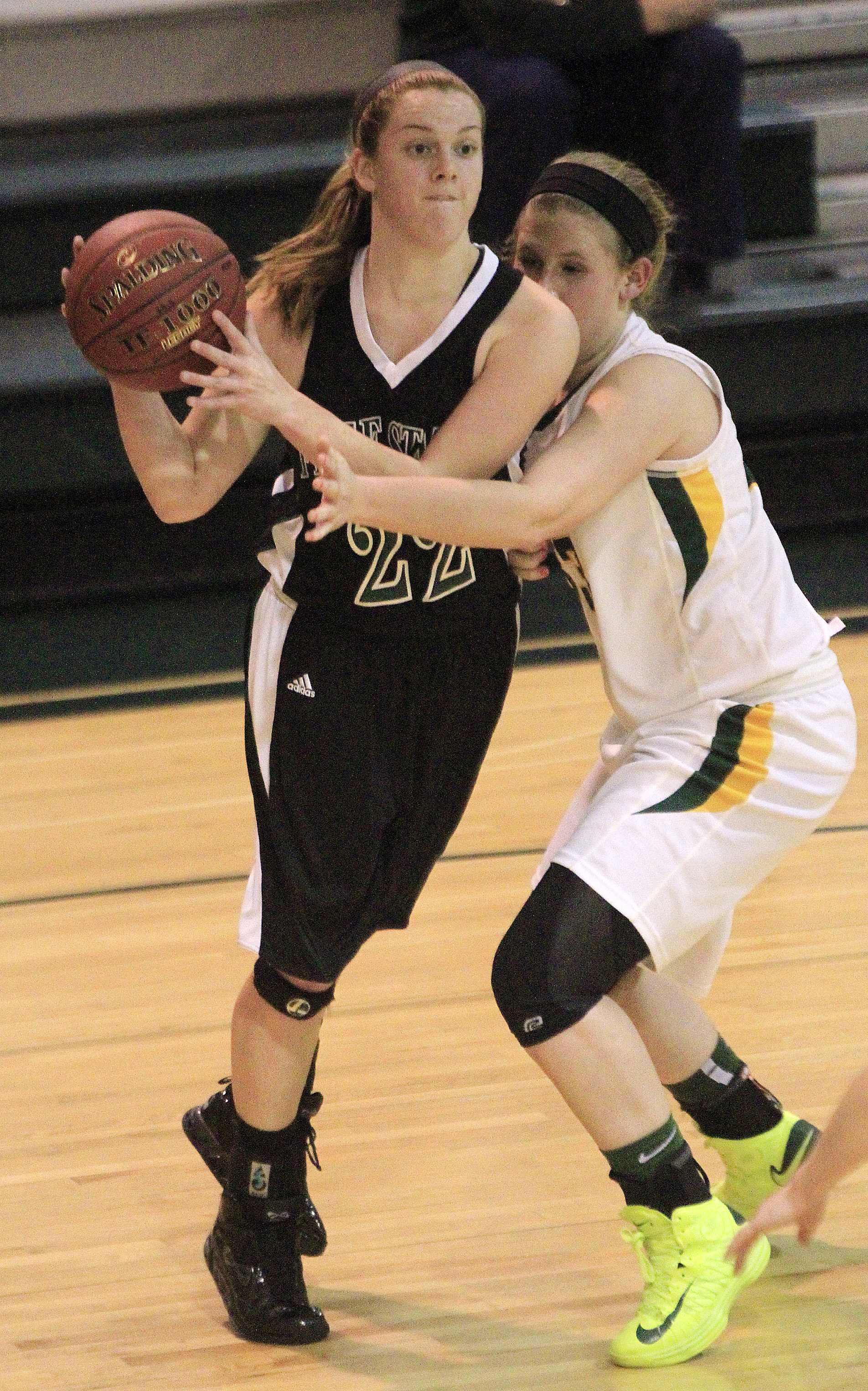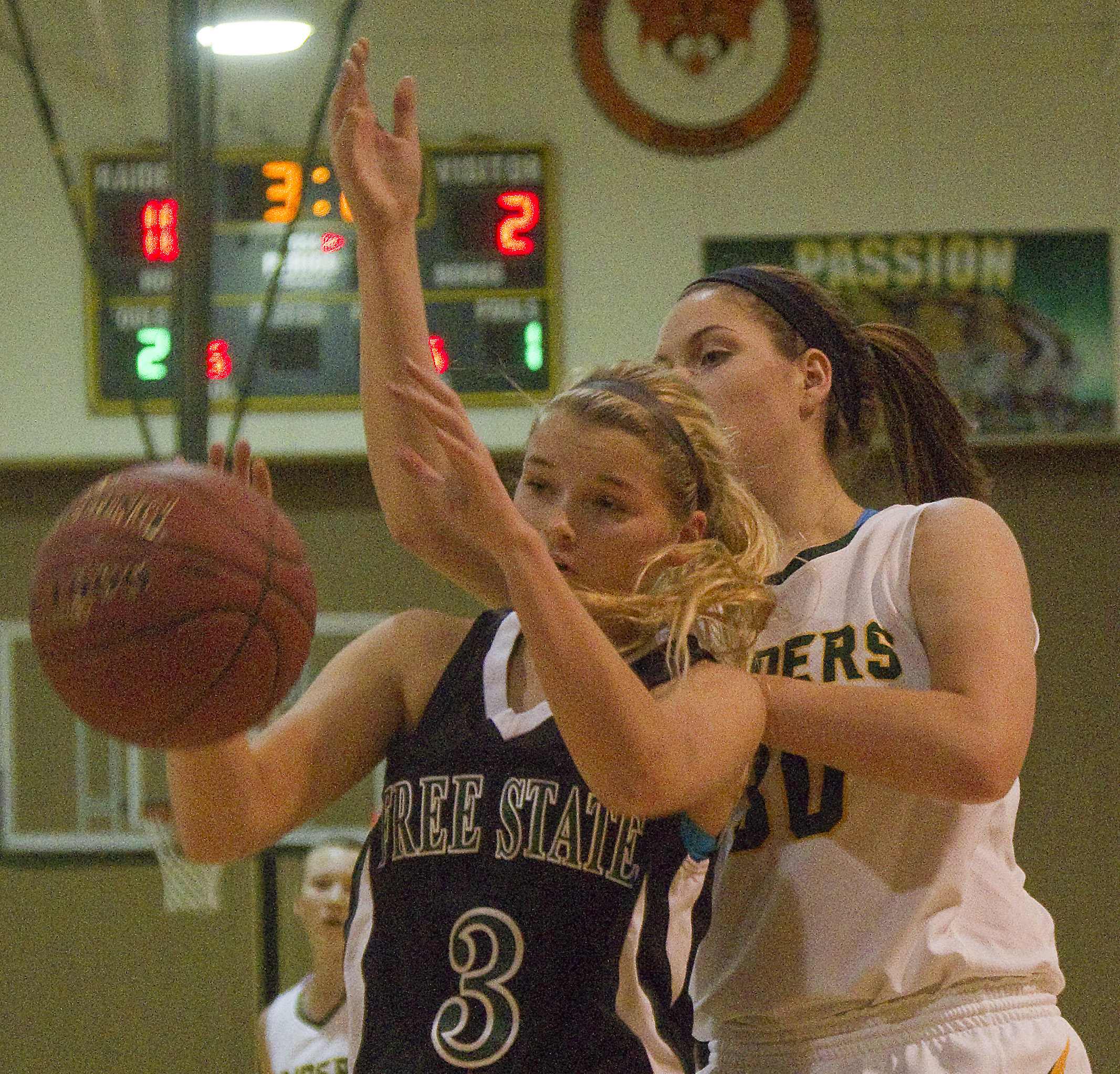 Free State High's Kennedy Kirkpatrick, right, hounds Shawnee Mission South's Sierra Roberts on Monday, Jan. 7, 2013, at SM South.