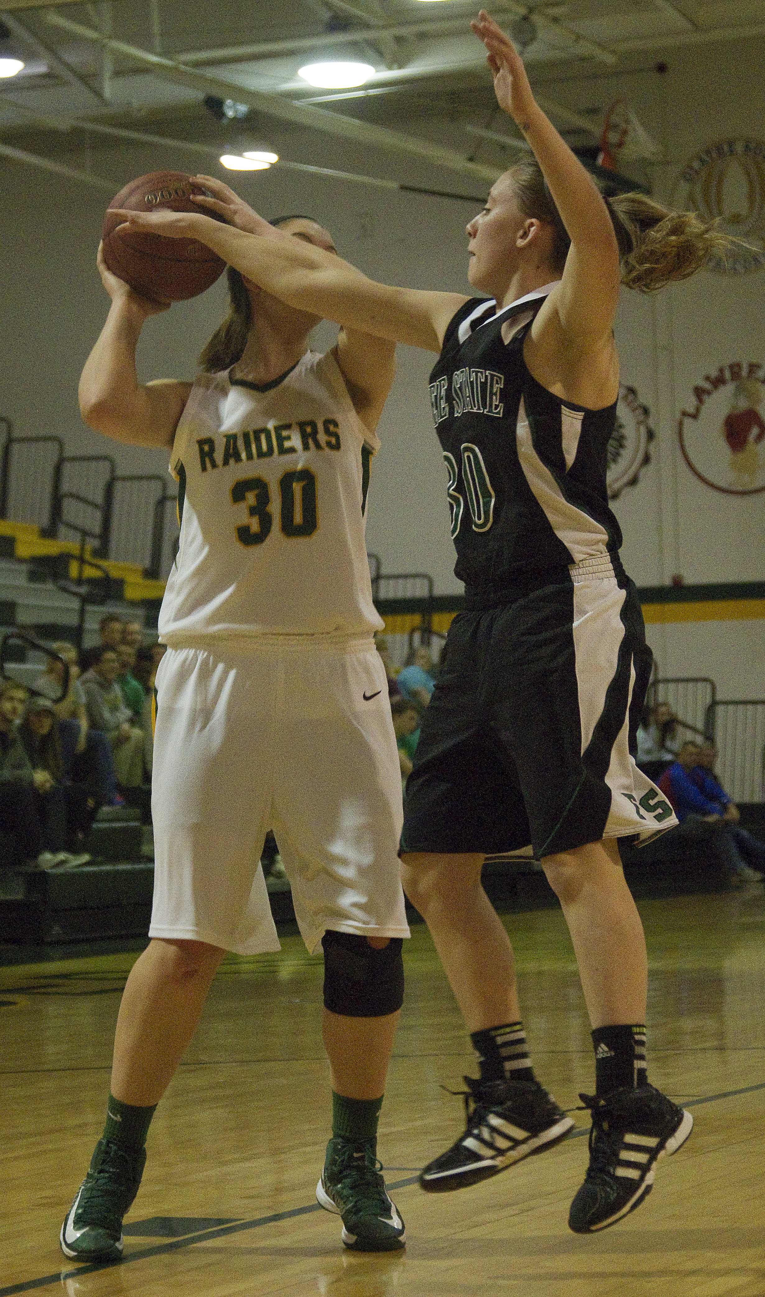 Free State senior Summer Frantz (30) tries for a block on Shawnee Mission South's Sam Bendrick (30) on Monday, Jan. 7, 2013, at SM South.