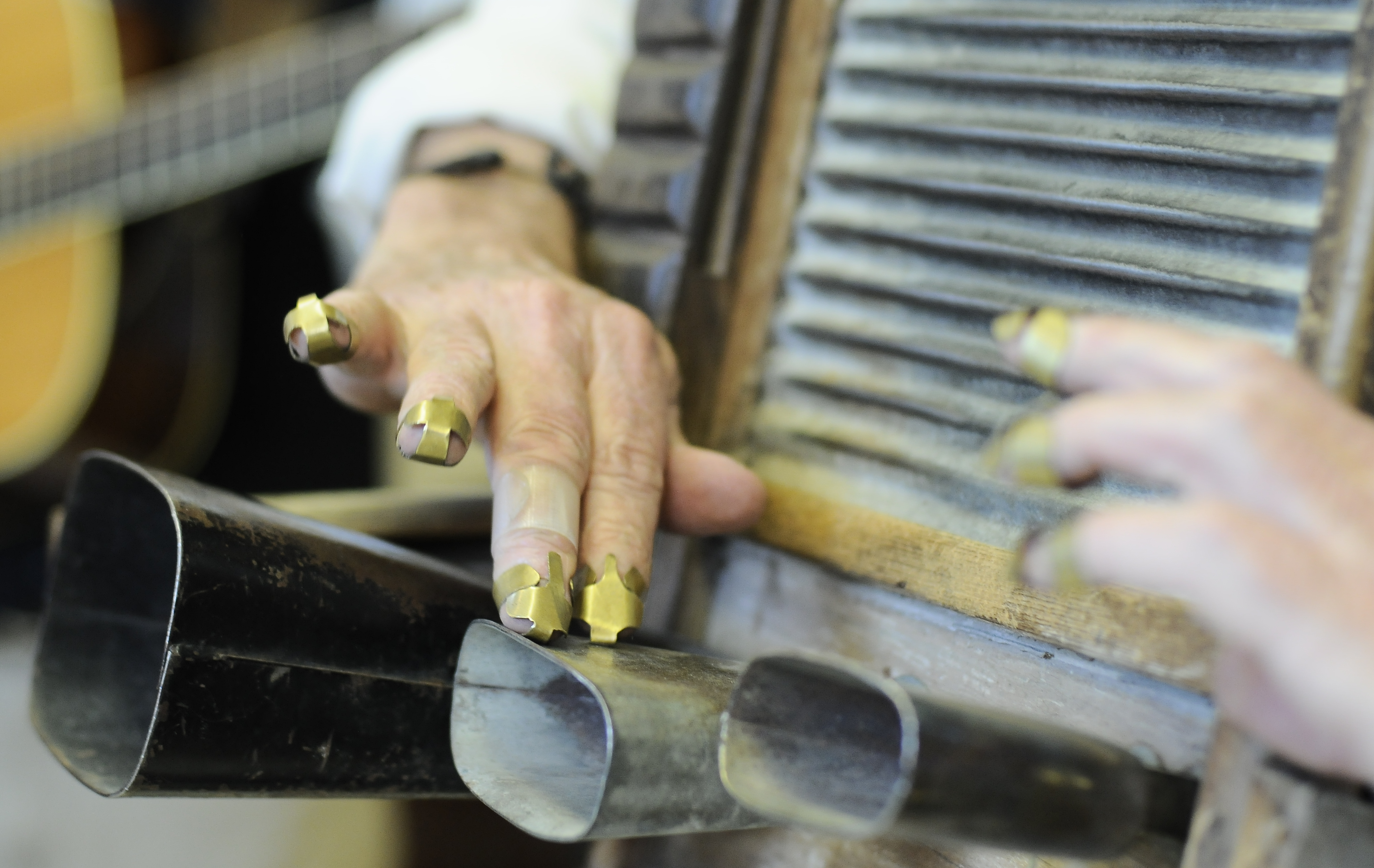 Jim Brothers works the cow bells during a performance by the Alferd Packer Memorial String Band Wednesday, April 15, 2009.