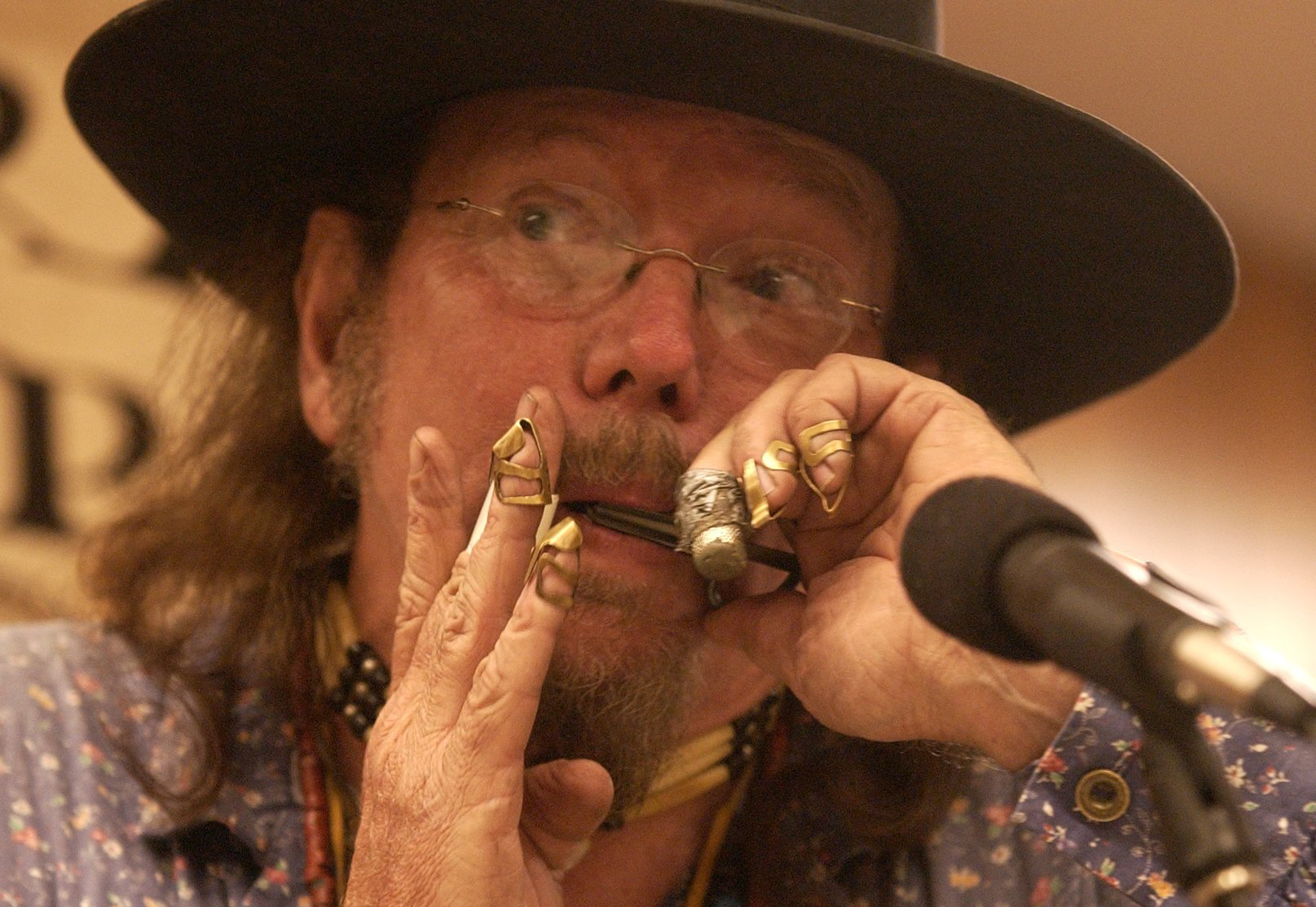Jim Brothers, of The Alfred Packer Memorial String Band plays the mouth harp for tax filing revlers at the downtown post office. Last minute tax filers were greeted annually on tax night by the band for over 20 years for the midnight filing deadline. Jim Brothers founded the Alferd Packer Memorial String Band in 1979. (File photo 2003)