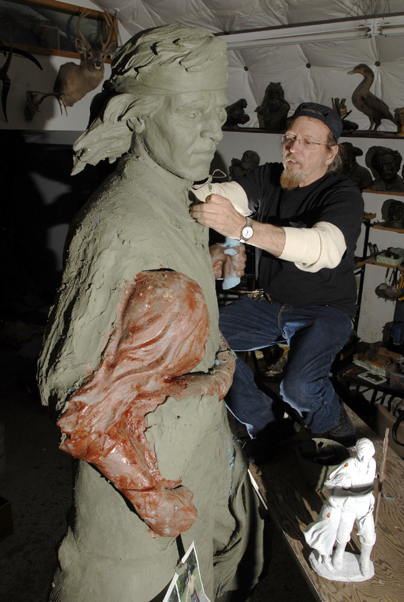 At right an early form of the John Brown Hawk takes shape in the studio of sculptor Jim Brothers. At left are clay figures Brothers is sculpting that will be added to his pieces already on site at the National D-Day Memorial in Bedford, Virginia where he is the principal sculptor.