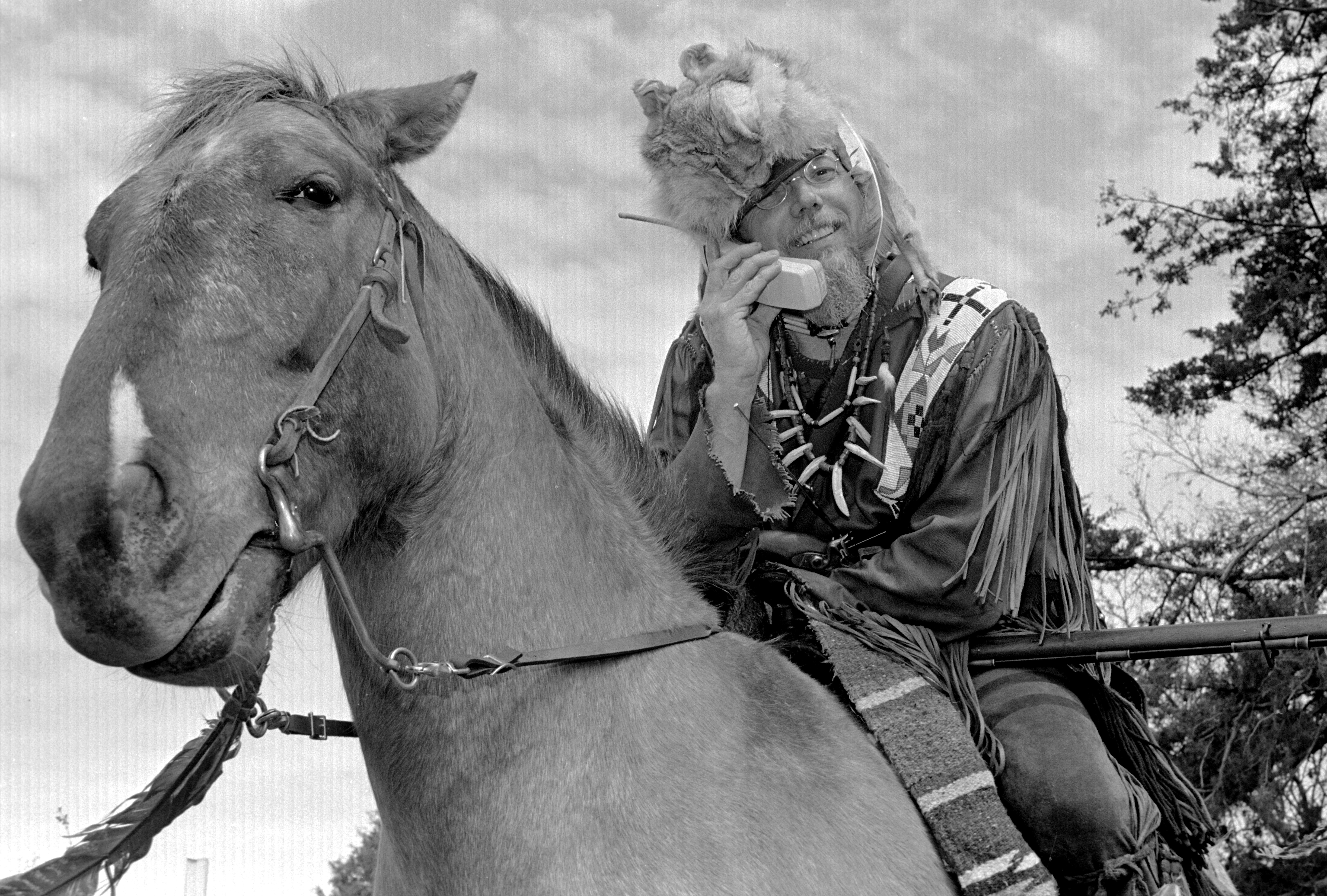 Jim Brothers takes a phone call during an Independence Day parade in Lawrence in the early 90's. .