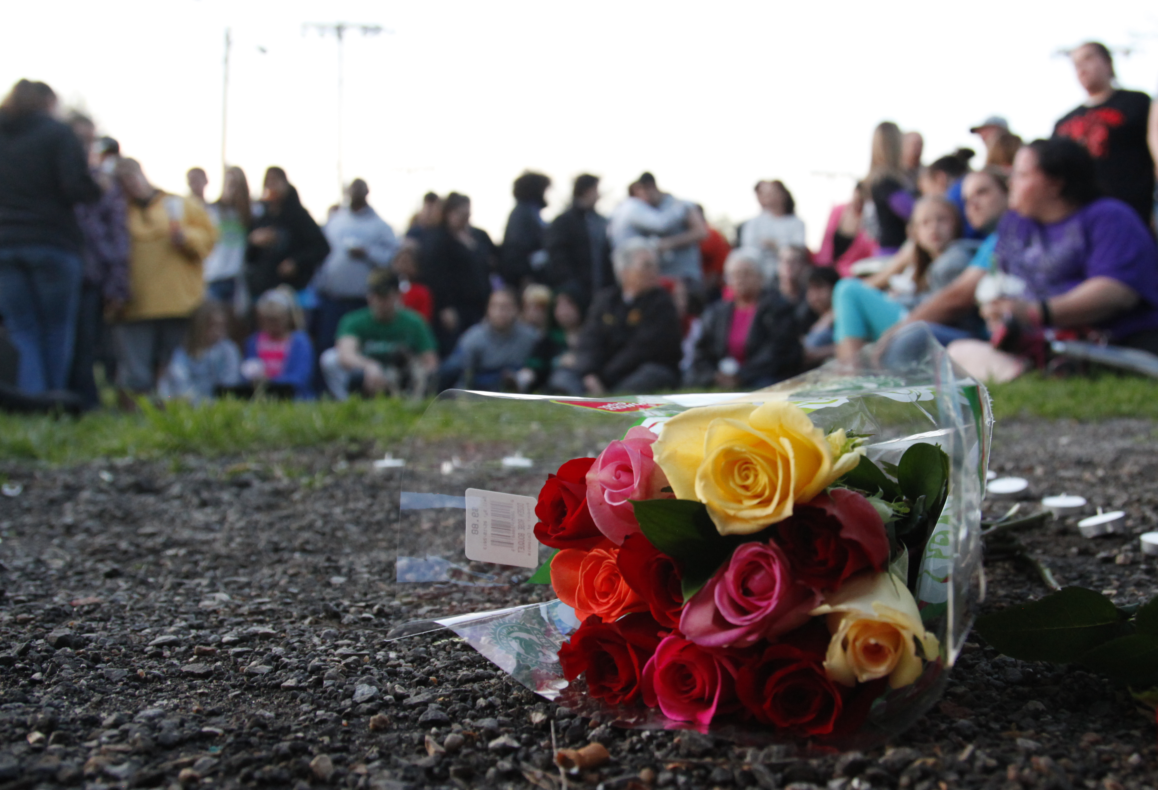 A bouquet of roses lie nearby a crowd gathered for a vigil to remember the homicide victims found in rural Ottawa this week, Friday, May 10, 2013 at Forest Park in Ottawa. Nick Krug/Journal-World Photo