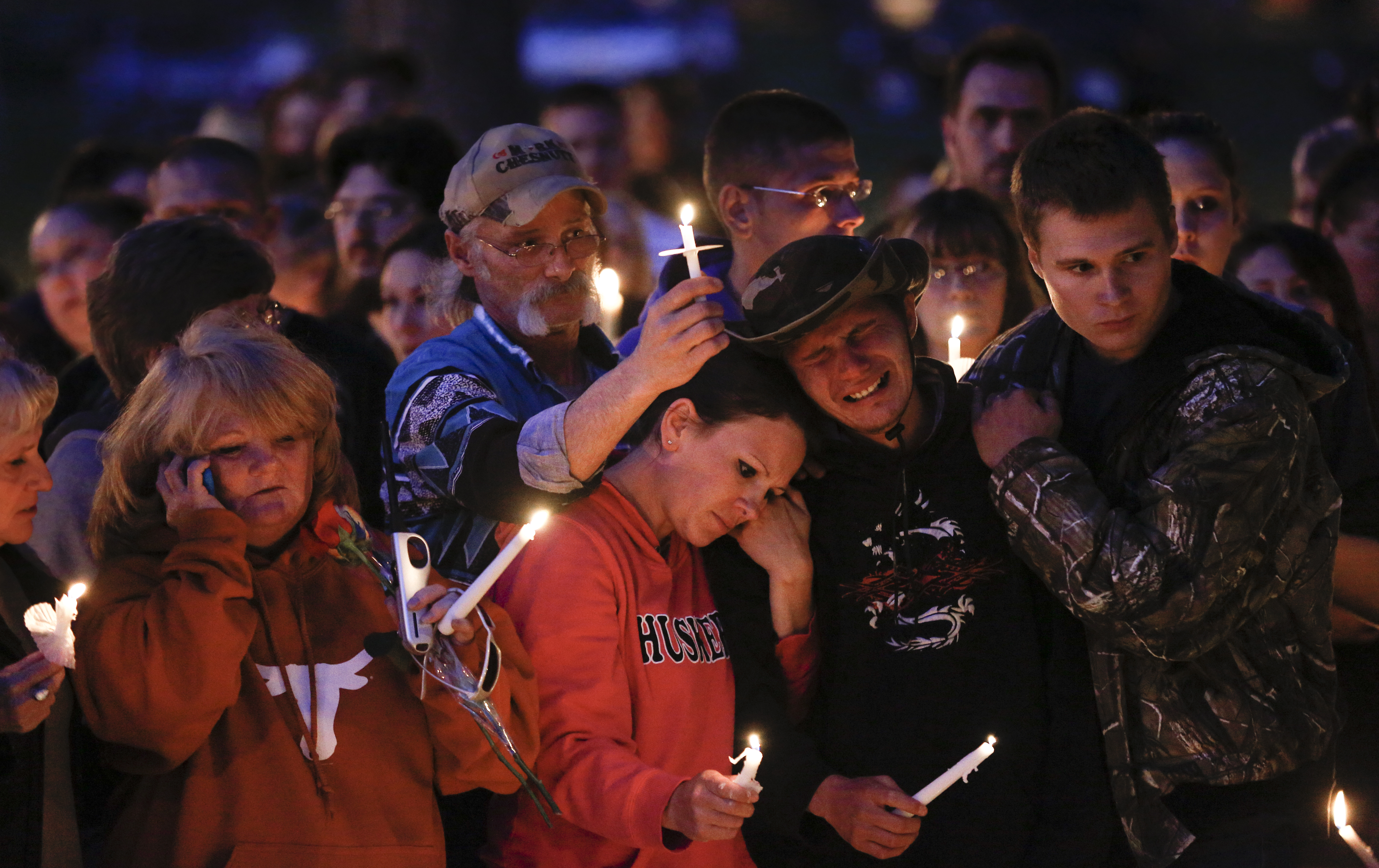 Friends Corey Schlotzhauer, right, Barbara Sells, center, and Tony Bass comfort Jackson Anderson, brother of Andrew Stout, during a vigil to remember the homicide victims found in rural Ottawa, Friday, May 10, 2013 at Forest Park in Ottawa. At left is Karon Anderson, mother of Stout. More than 400 community members, friends and family members attended the vigil. Nick Krug/Journal-World Photo