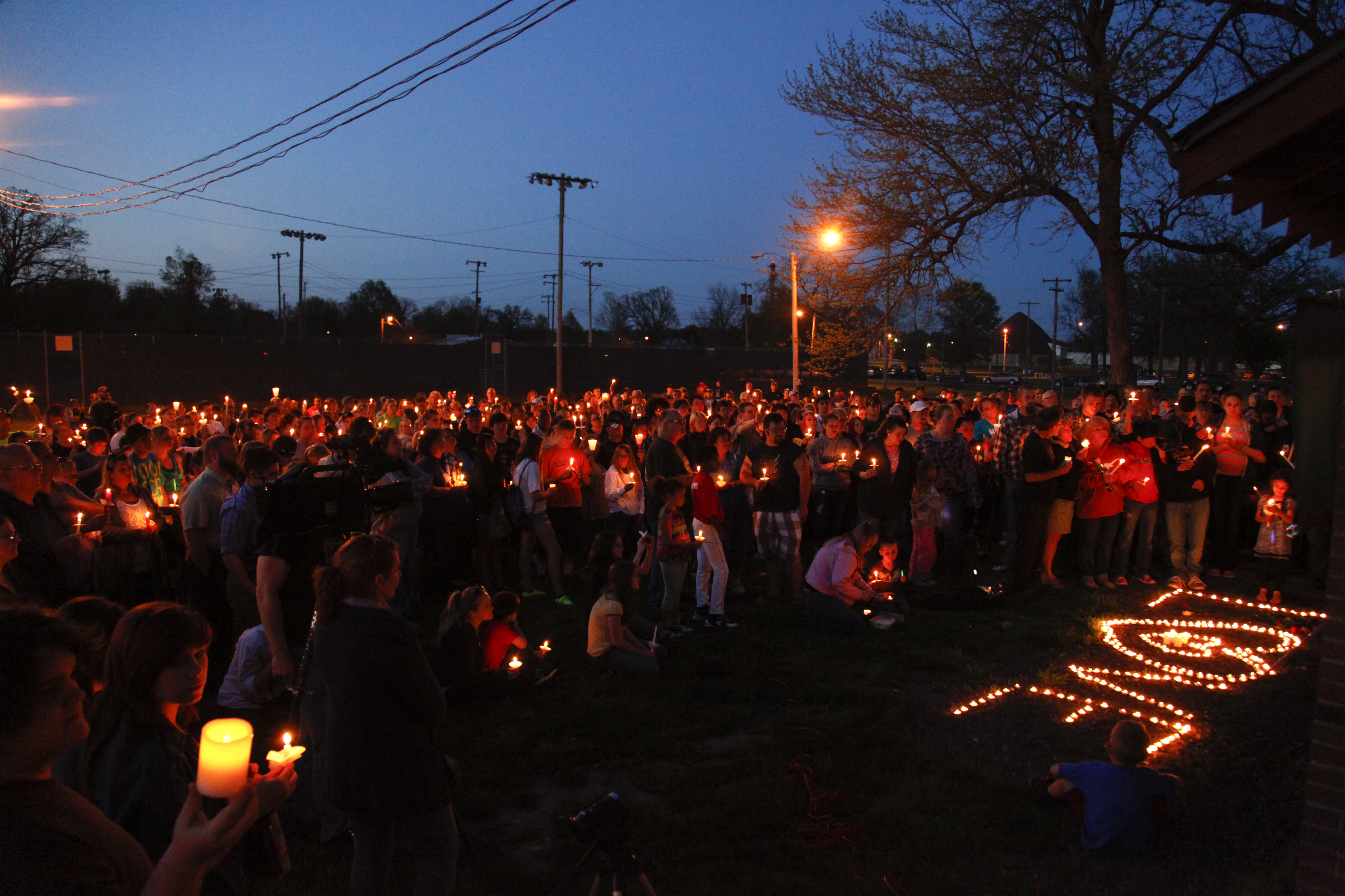 The word "Love" is spelled with candles as over 400 community members friends and family members gather for a vigil to remember the homicide victims found in rural Ottawa this week, Friday, May 10, 2013 at Forest Park in Ottawa. Nick Krug/Journal-World Photo