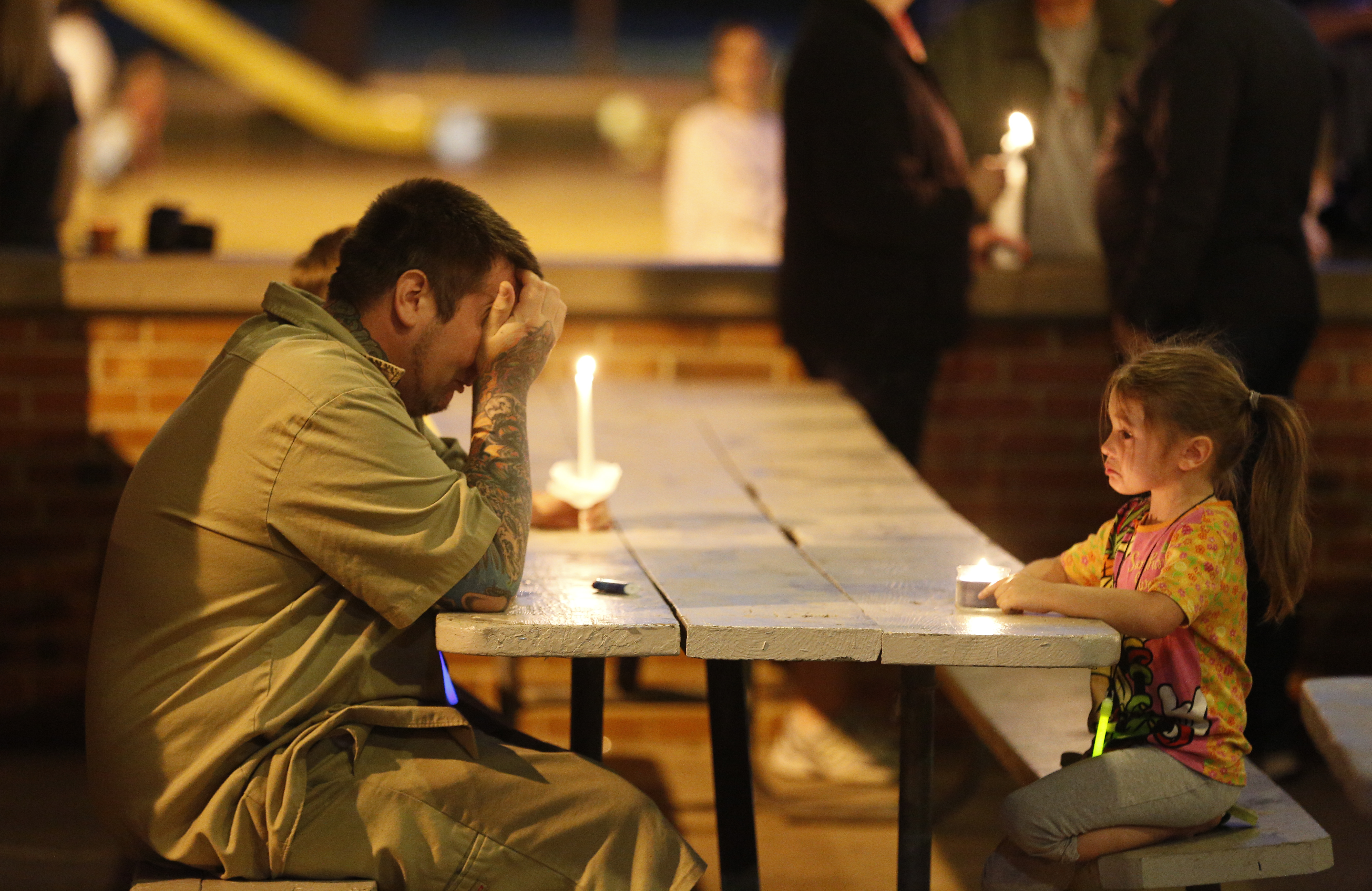 Thomas Reyes, friend of Andrew Stout and Steven White, breaks down as his daughter Sierra Reyes, 4, watches during a vigil to remember the homicide victims, Friday, May 10, 2013 at Forest Park in Ottawa. Nick Krug/Journal-World Photo