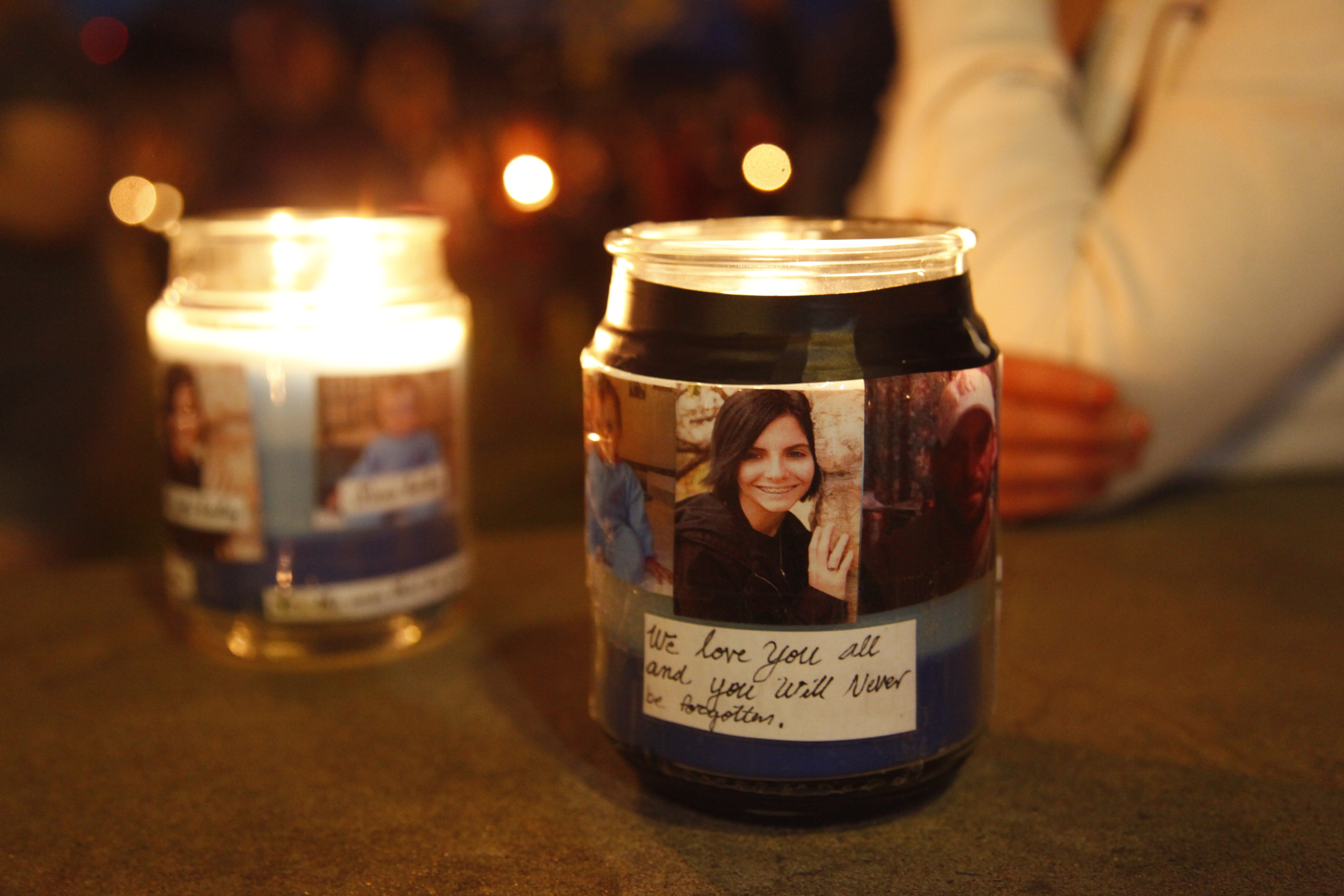 A candle wrapped with pictures of the Ottawa homicide victims, with Kaylie Kathleen Bailey, of Olathe, front right, was lighted during a vigil Friday, May 10, 2013 at Forest Park in Ottawa.