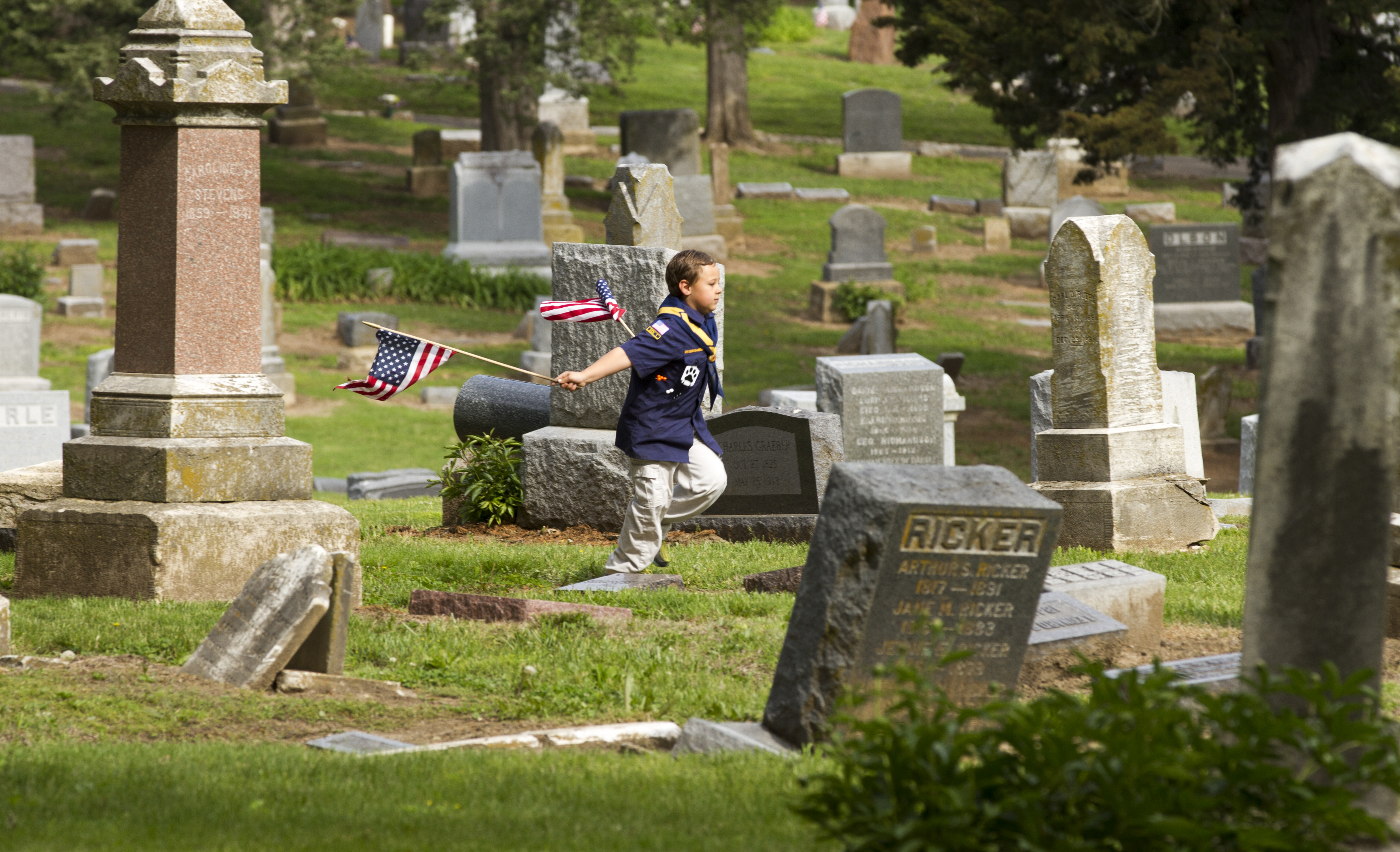 Seven-year-old Logan Fullerton, Lawrence, runs through Oak Hill Cemetery with American flags waving behind him Saturday morning. Logan, who is part of cub scout troop 3055, was at the cemetery placing flags next to the grave stones of Civil War veterans who fought for the Union. The event was sponsored by the Sons of Union Veterans of the Civil War.