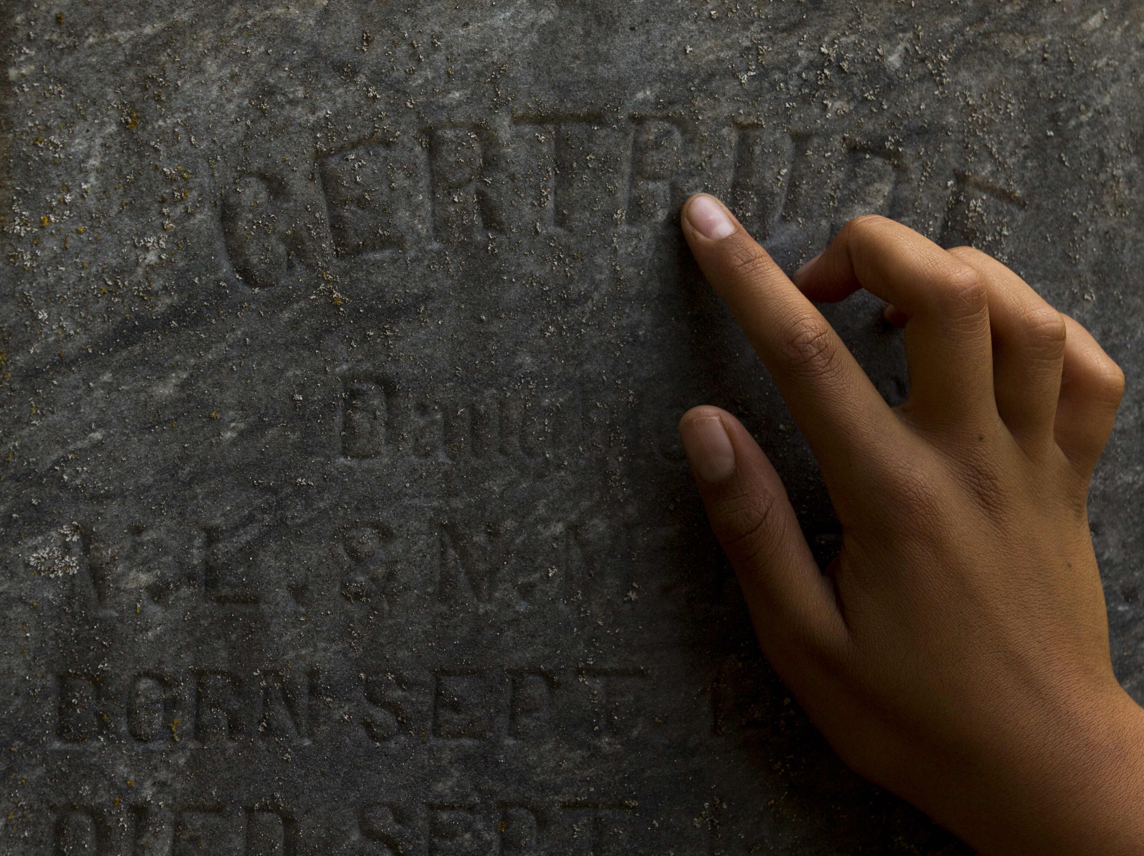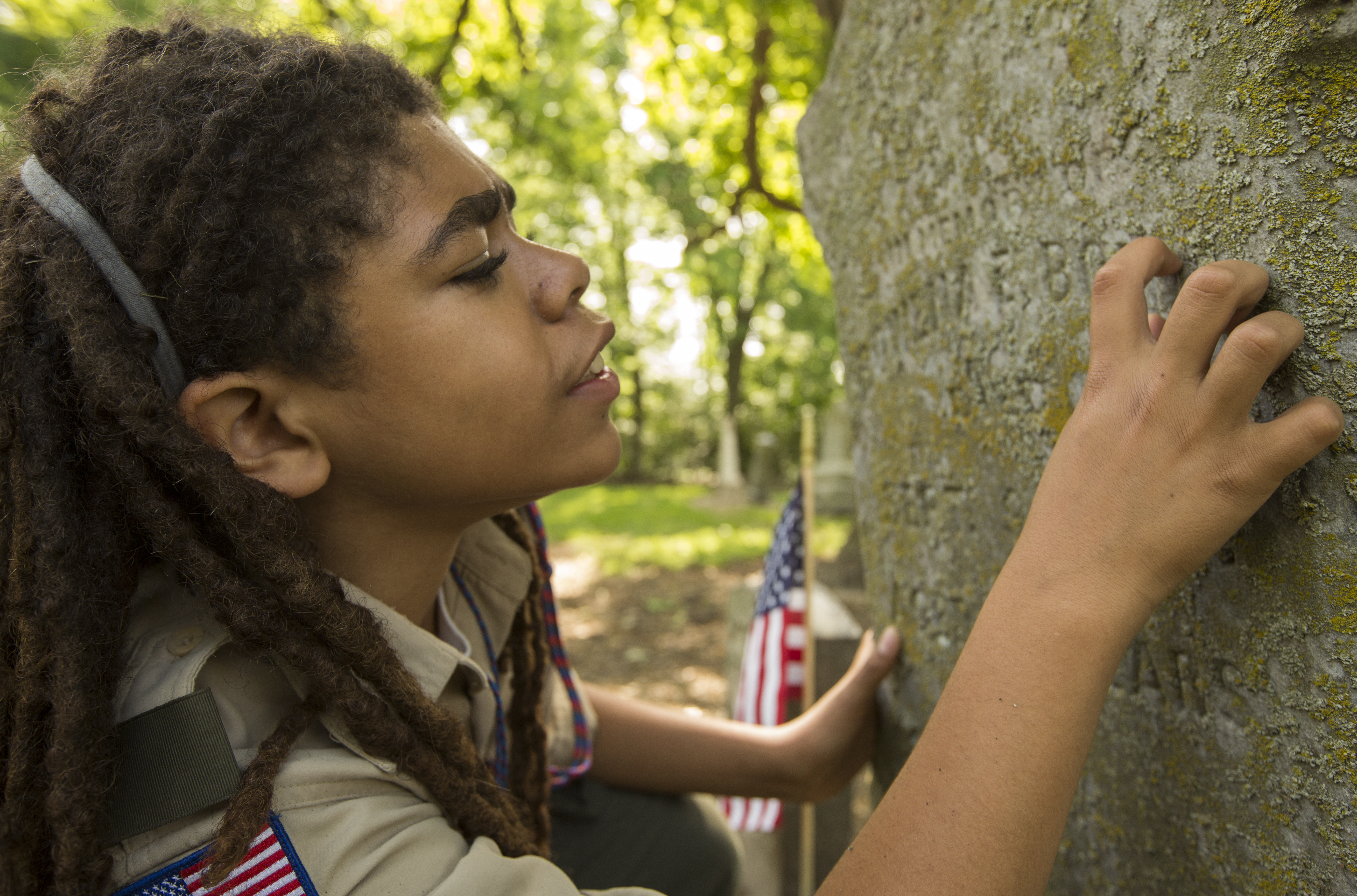 Eleven-year-old Kindred Curry traces his finger along the engraving of an old tombstone at Oak Hill Cemetery Saturday morning. Kindred, who is part of boy scout troop 61, was at the cemetery placing flags next to the grave stones of Civil War veterans who fought for the Union. The event was sponsored by the Sons of Union Veterans of the Civil War.