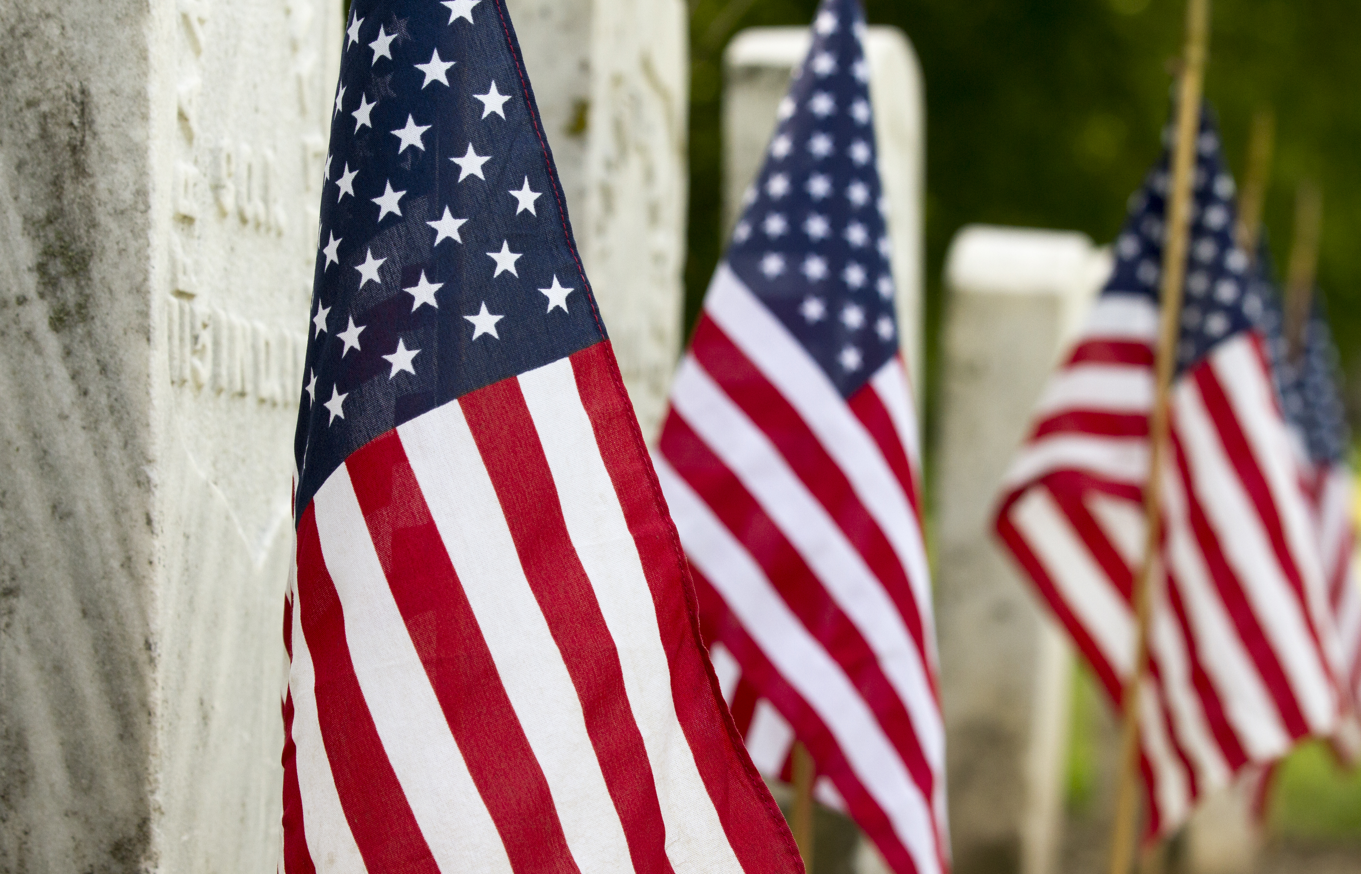 American flags line the gravestones of Union Civil War veterans Saturday at Oak Hill Cemetery. Volunteers spent Saturday morning placing the flags in an event that was sponsored by the Sons of Union Veterans of the Civil War.