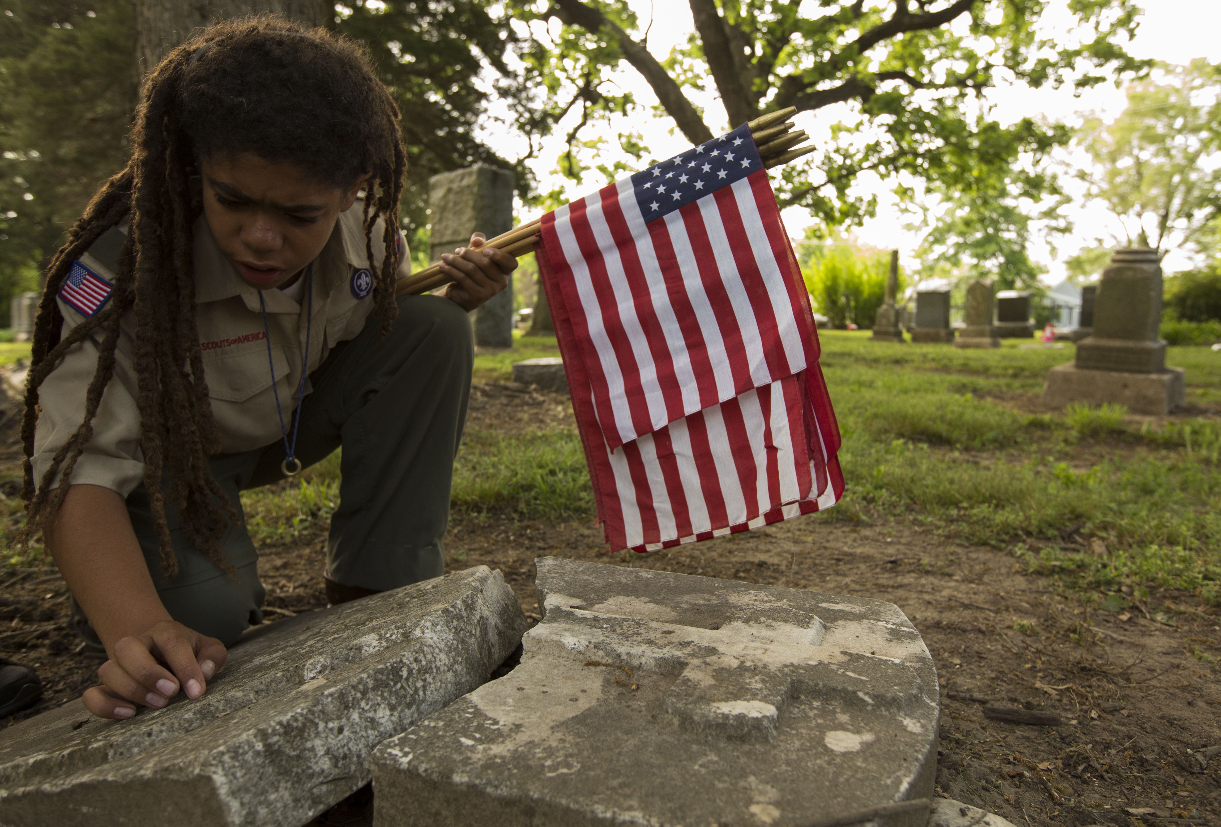 Eleven-year-old Kindred Curry traces his finger along the engraving of an old tombstone as he tries to make out the name at Oak Hill Cemetery Saturday morning. Kindred, who is part of boy scout troop 61, was at the cemetery placing flags next to the grave stones of Civil War veterans who fought for the Union. The event was sponsored by the Sons of Union Veterans of the Civil War.