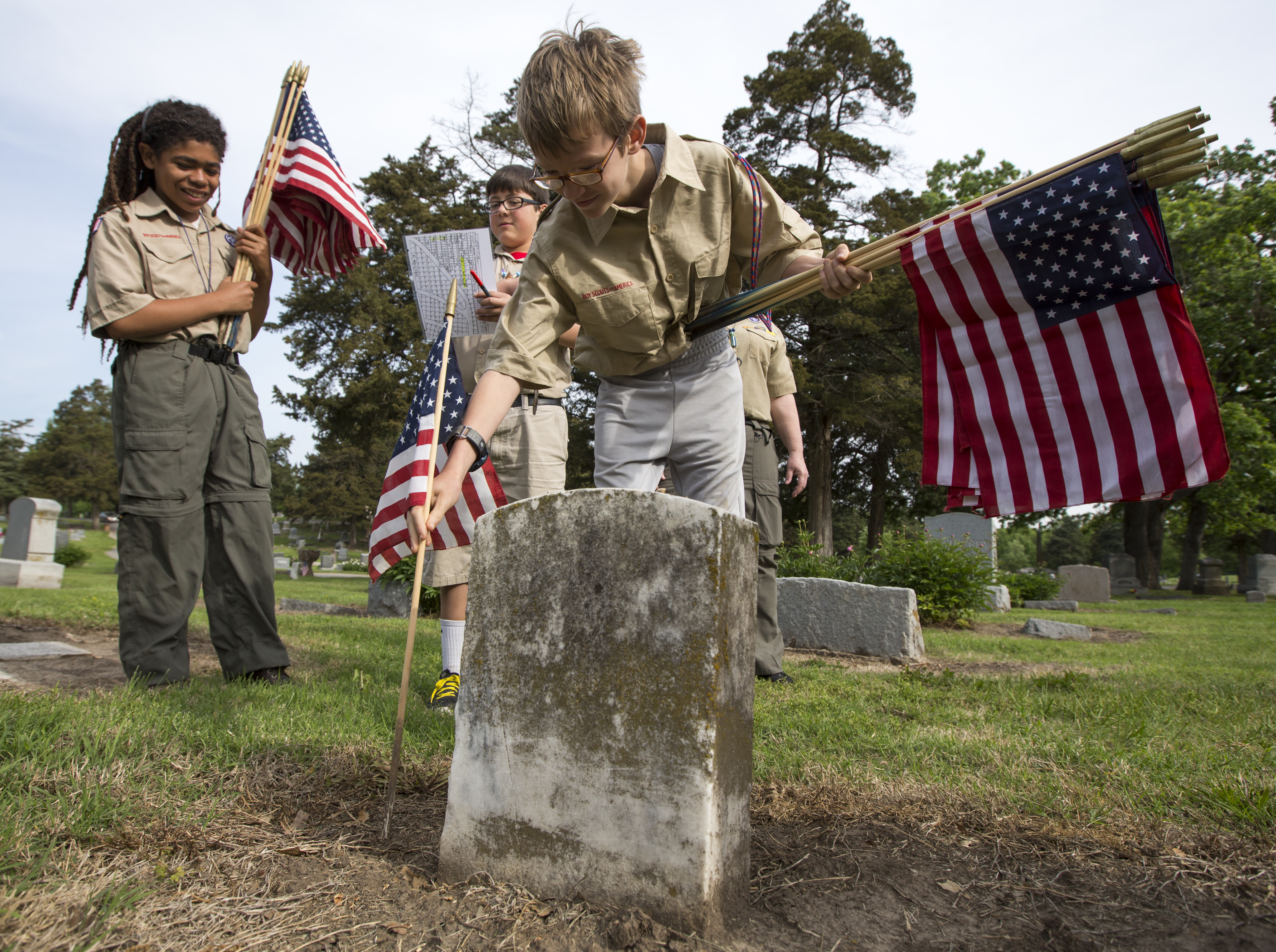 Eleven-year-old Brendon Murphy places a flag next to the gravestone of a Union Civil War veteran while Kindred Curry, 11, left, and Ian Archer, watch, Saturday morning at Oak Hill Cemetery in east Lawrence. The boys, who are all part of boy scout troop 61, were at the cemetery placing flags next to the grave stones of Civil War veterans who fought for the Union. The event was sponsored by the Sons of Union Veterans of the Civil War.
