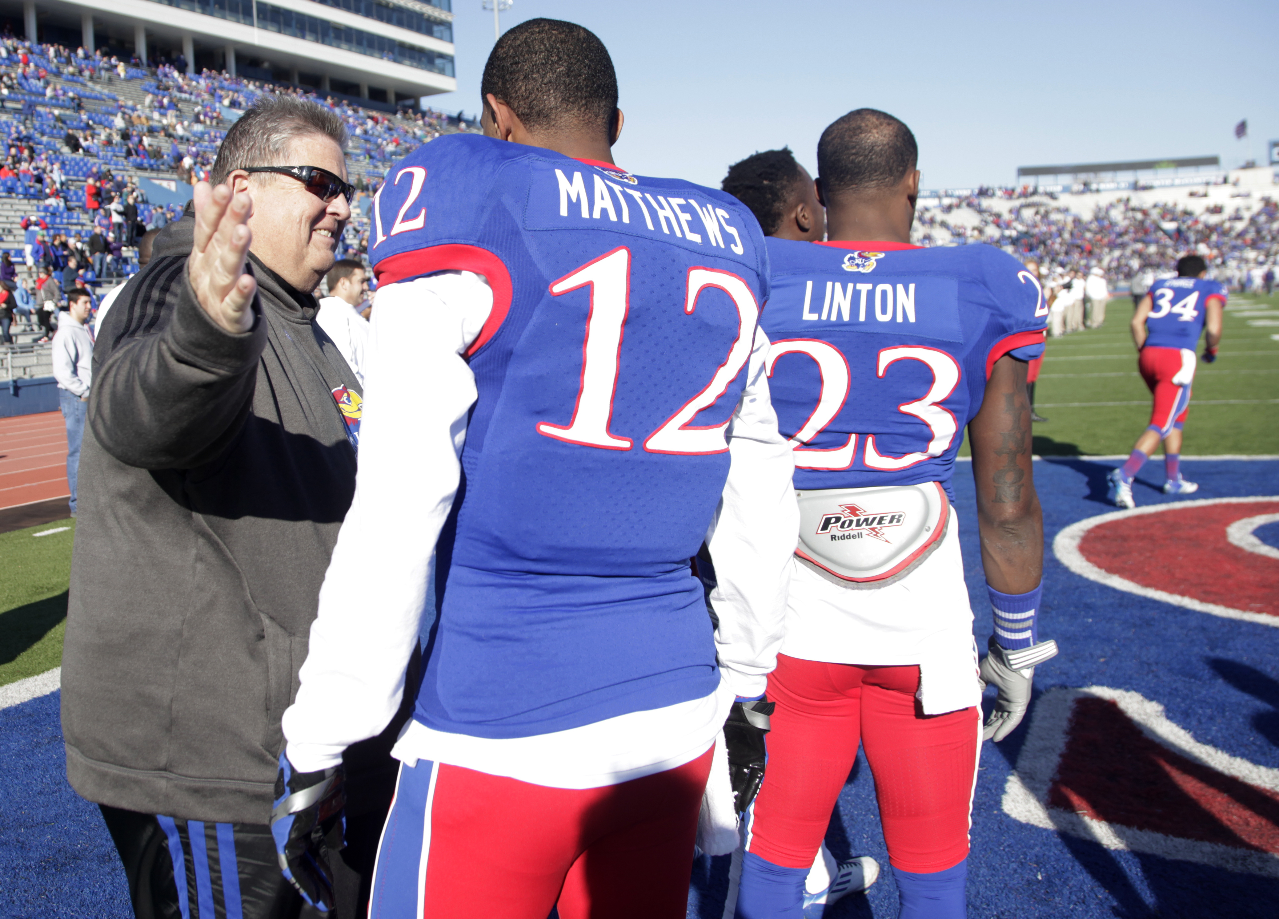 Kansas coach Charlie Weis, left, greets senior Christian Matthews (12) during a senior day celebration before the Jayhawks' game against the Kansas State University Wildcats, Saturday at Memorial Stadium. The Jayhawks lost 31-10 to the Wildcats.