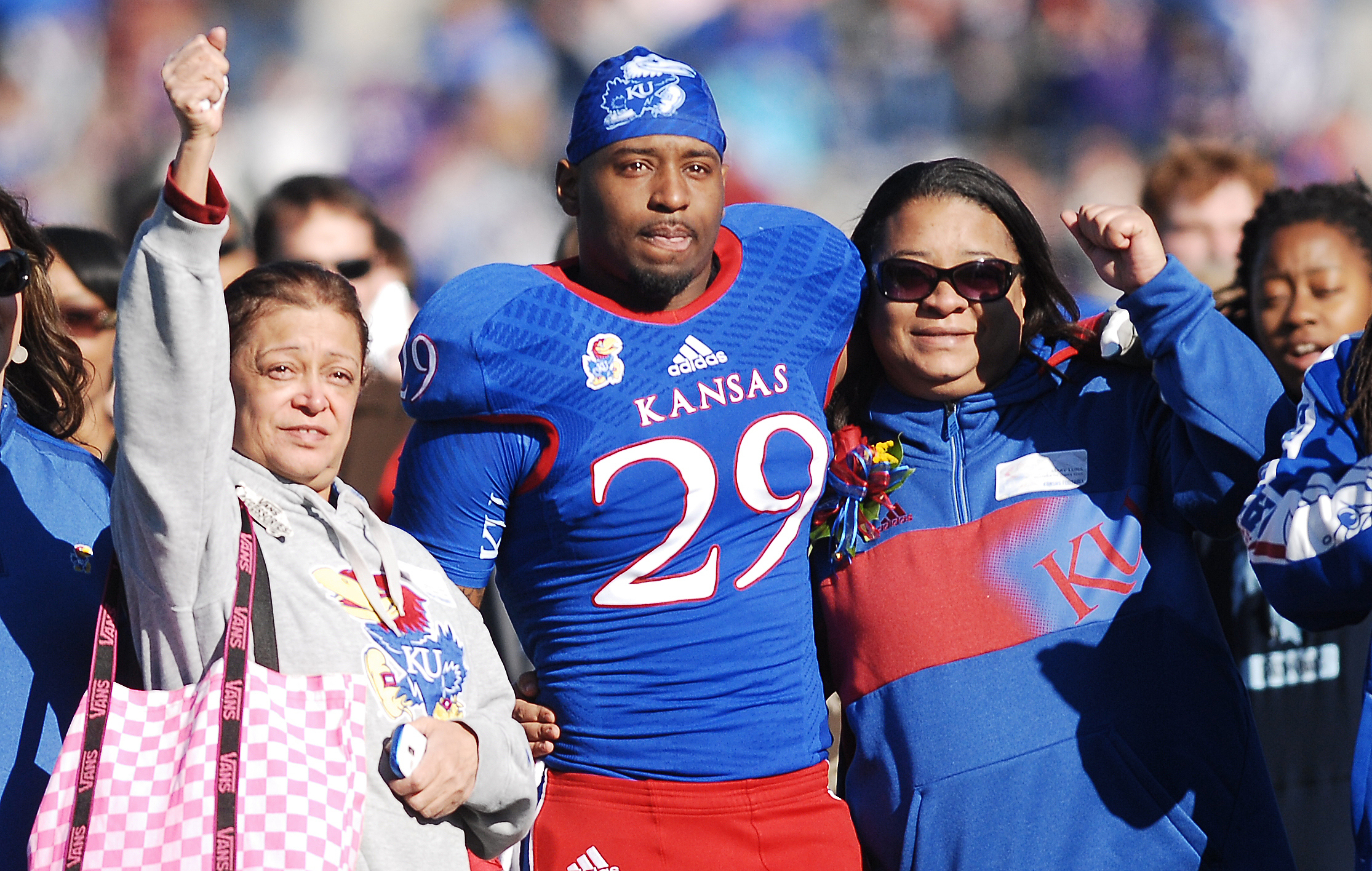 Kansas University senior running back James Sims (29) stands with his grandmother, Juana Luna, left, and his mother, Mary Luna, as they watch a video of Sims during senior day recognition before the Jayhawks' game against Kansas State, Saturday at Memorial Stadium.