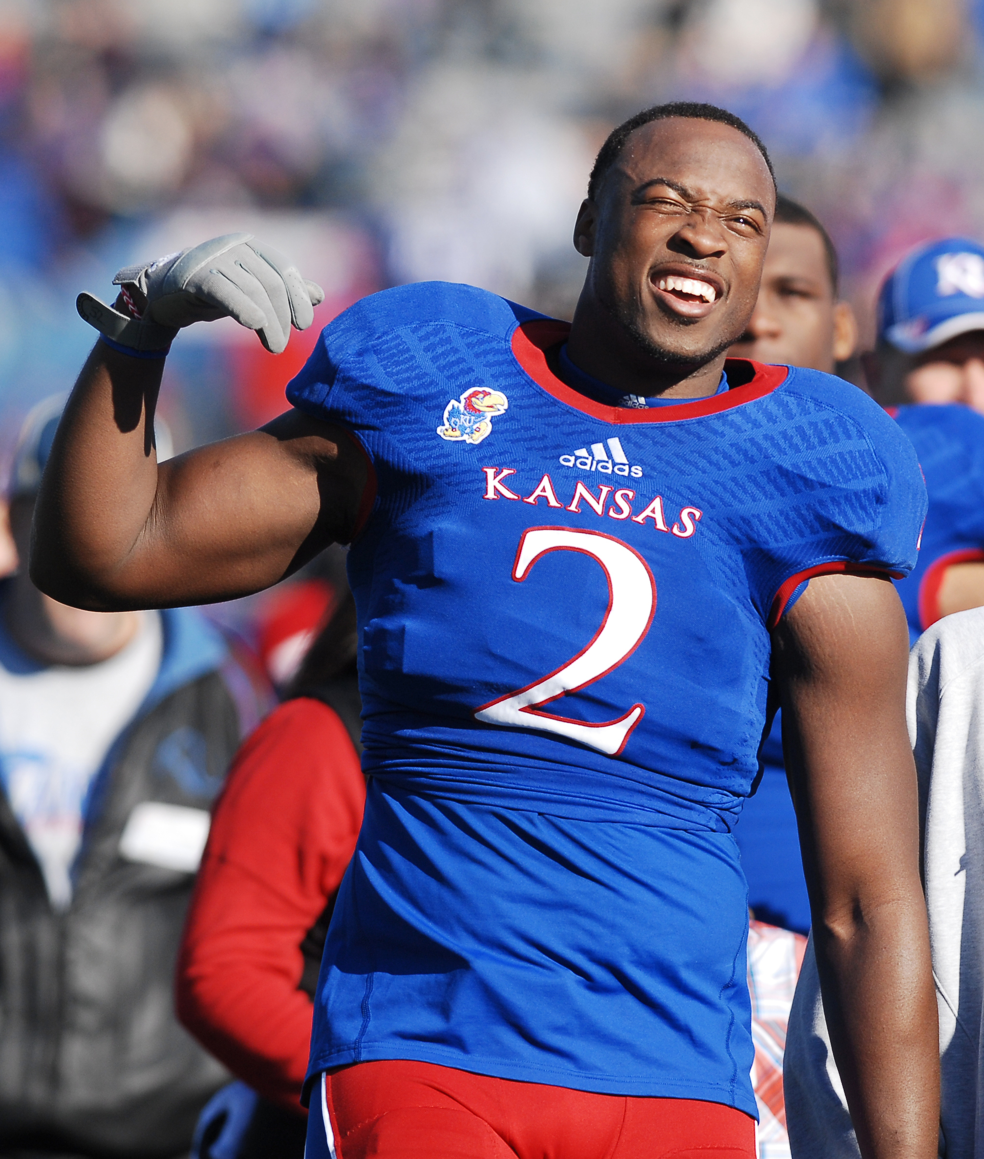 Kansas senior Darius Willis (2) reacts to a video of himself during a senior day recognition before the Jayhawks game against KSU Saturday at Memorial Stadium.