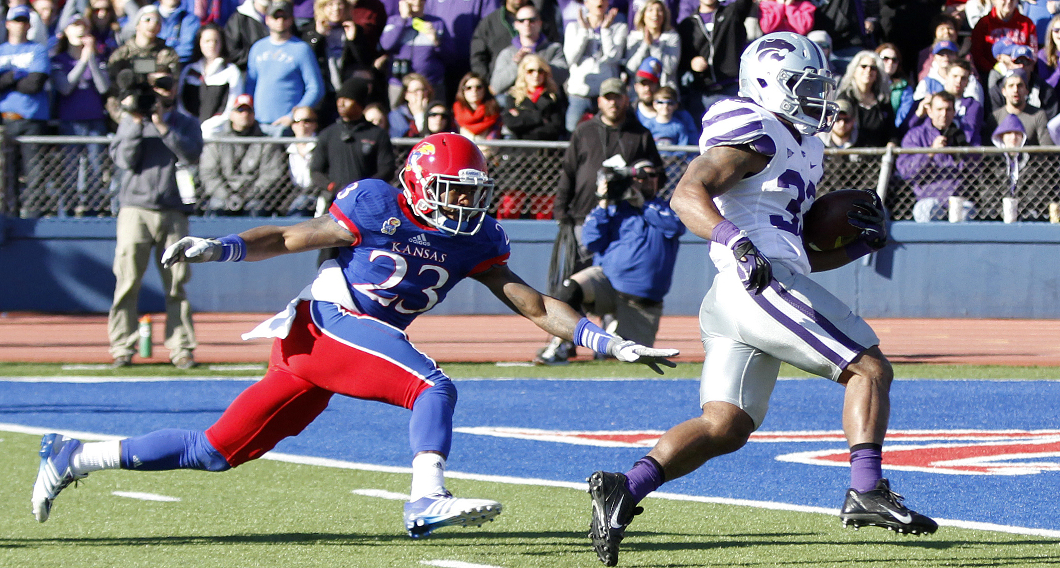 Kansas State running-back John Hubert (33) runs past Kansas safety Dexter Linton (23) to score in the first-half of the Jayhawks game against KSU Saturday at Memorial Stadium.