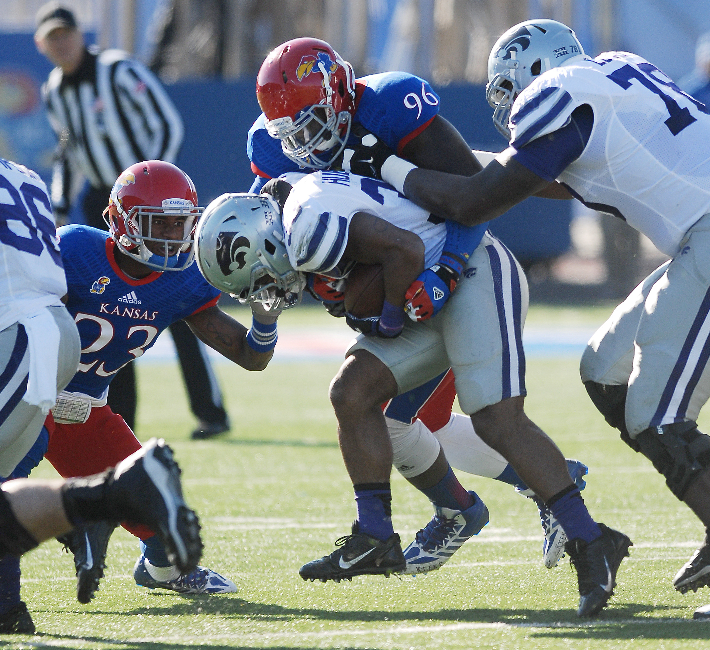 Kansas seniors Dexter Linton (23) and Keba Agostinho (96) bring down Kansas State running-back John Hubert (33) in the Jayhawks game against KSU Saturday at Memorial Stadium.
