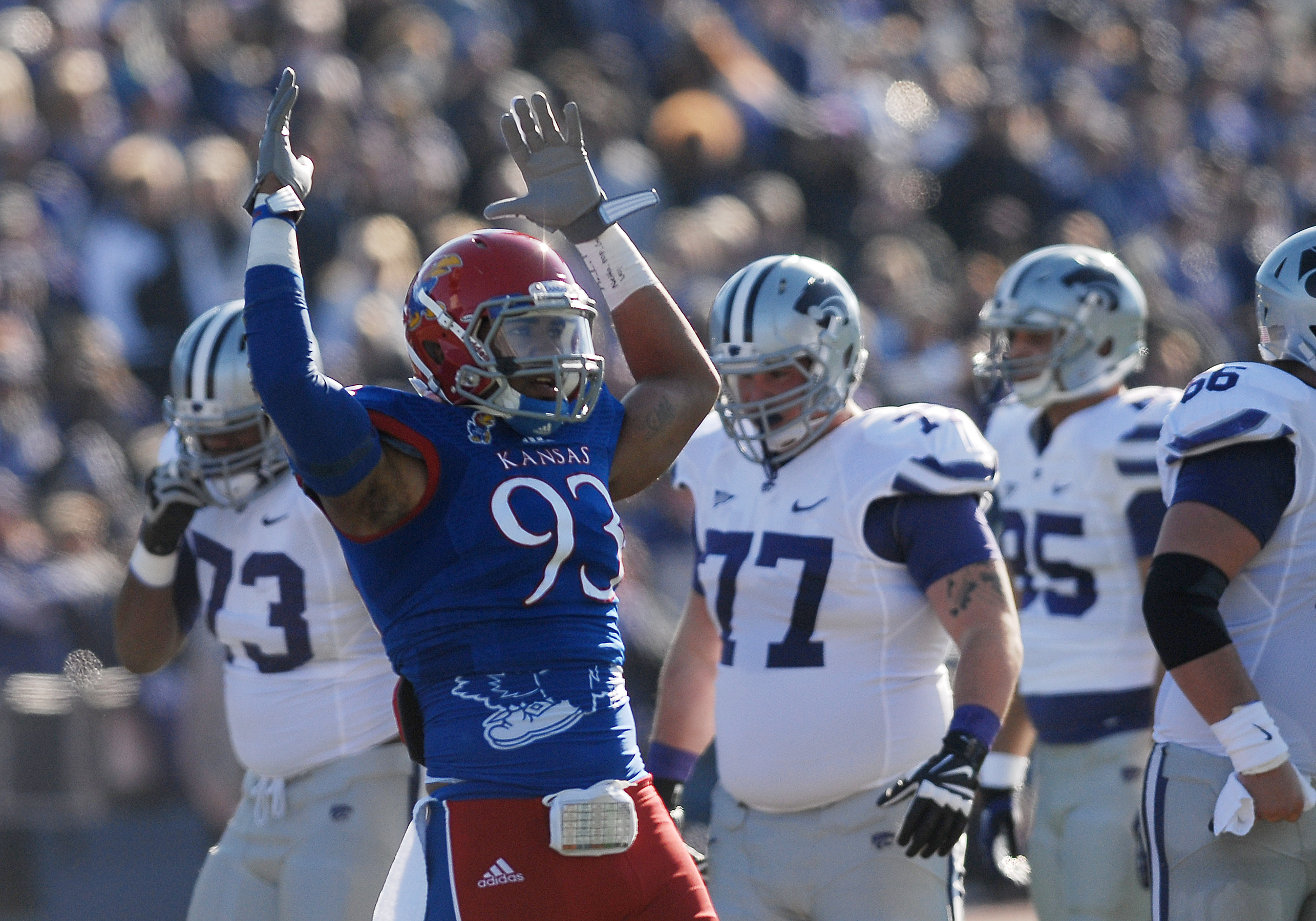 Kansas defender Ben Goodman (93) pumps his arms in the air to get the crowd into the game during the first-half of the Jayhawks game against KSU Saturday at Memorial Stadium.