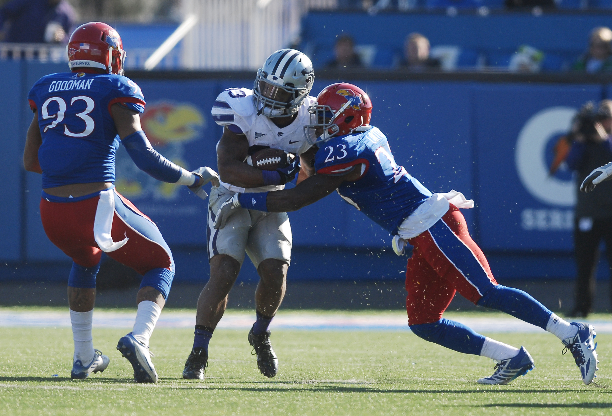 Kansas defender Ben Goodman (93), left, and Dexter Linton (23), right, tackle Kansas State running-back John Hubert (33) in the Jayhawks 31-10 loss to the Kansas State Wildcats Saturday at Memorial Stadium.