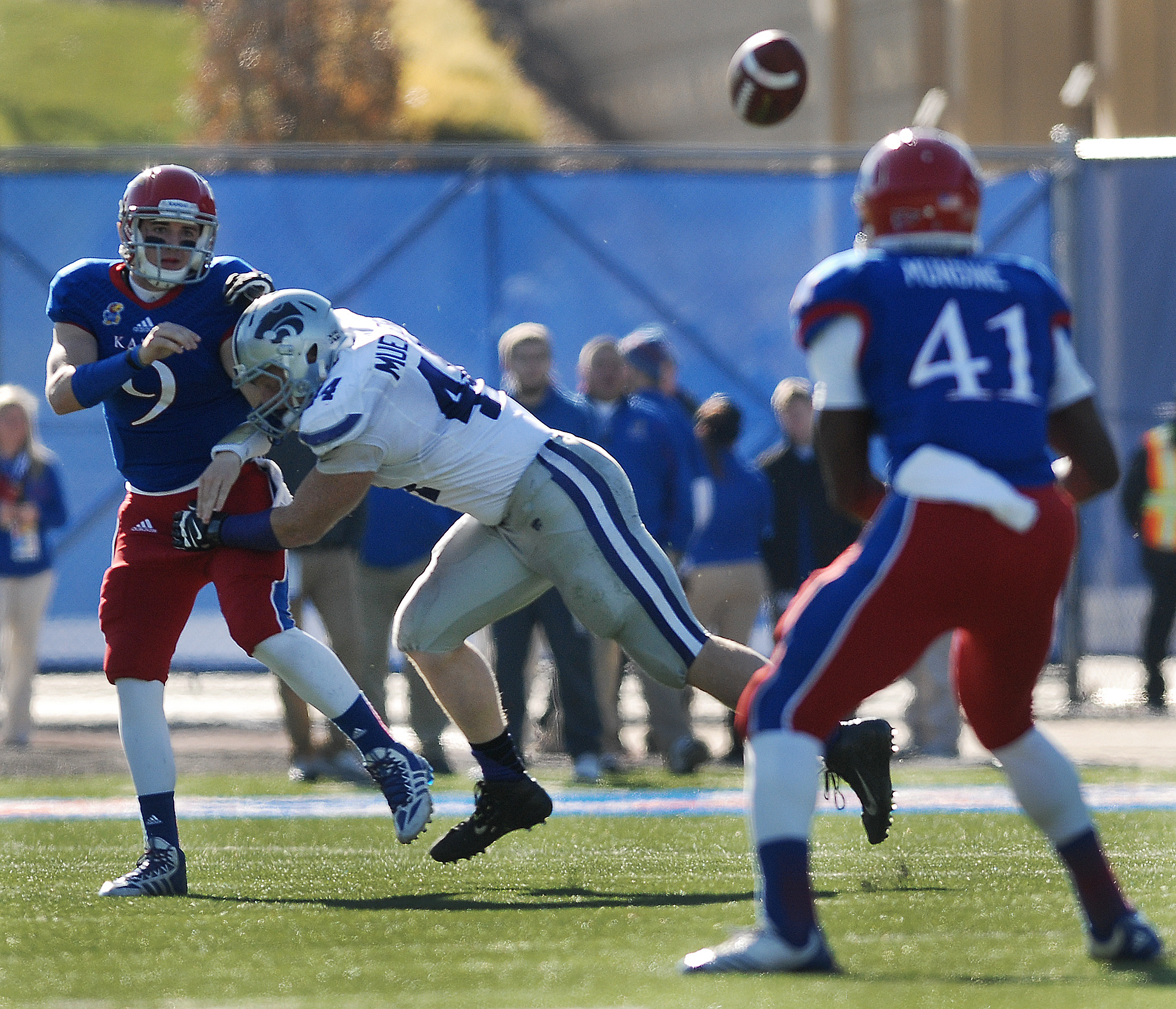 Kansas quarterback Jake Heaps (9) throws to Jimmay Mundine (41) as Heaps is hit by KSU defensive end Ryan Mueller (44) in the Jayhawks 31-10 loss to the Kansas State Wildcats Saturday at Memorial Stadium.