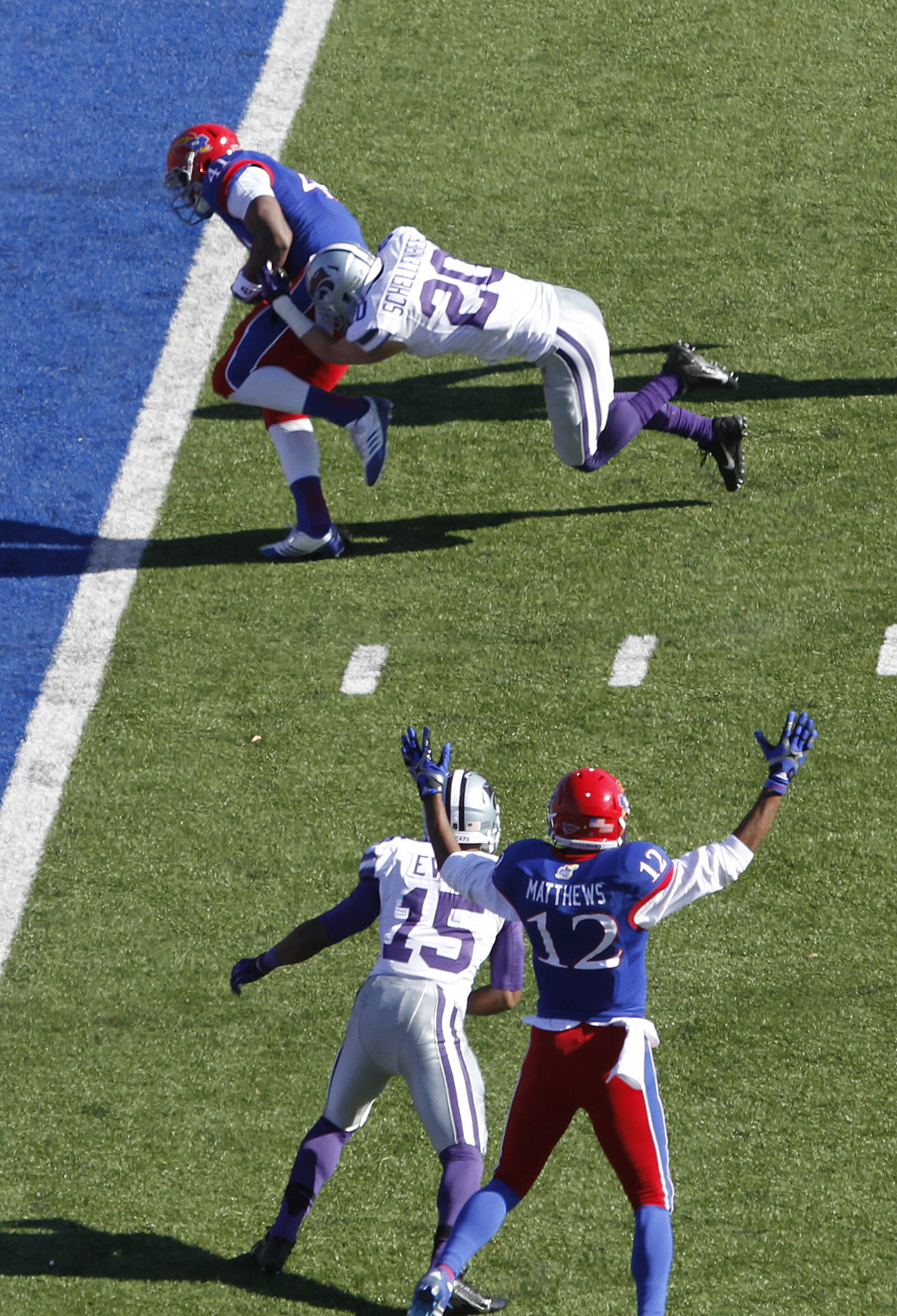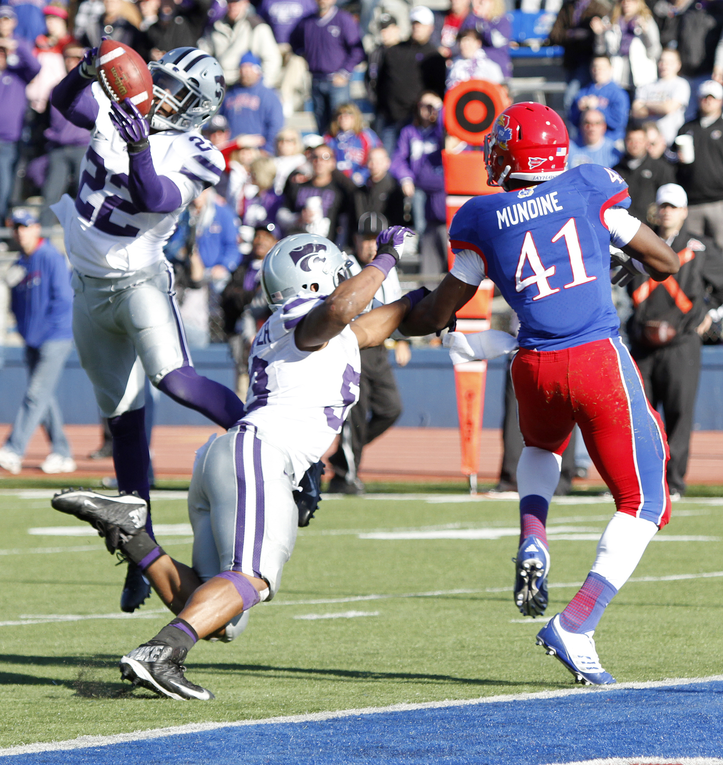 Kansas State defensive back Dante Barnett (22) intercepts the ball at the KU goal line in front of KSU defender Blake Slaughter (53) and Kansas receiver Jimmay Mundine (41) during the Jayhawks 31-10 loss to the Kansas State Wildcats Saturday at Memorial Stadium.