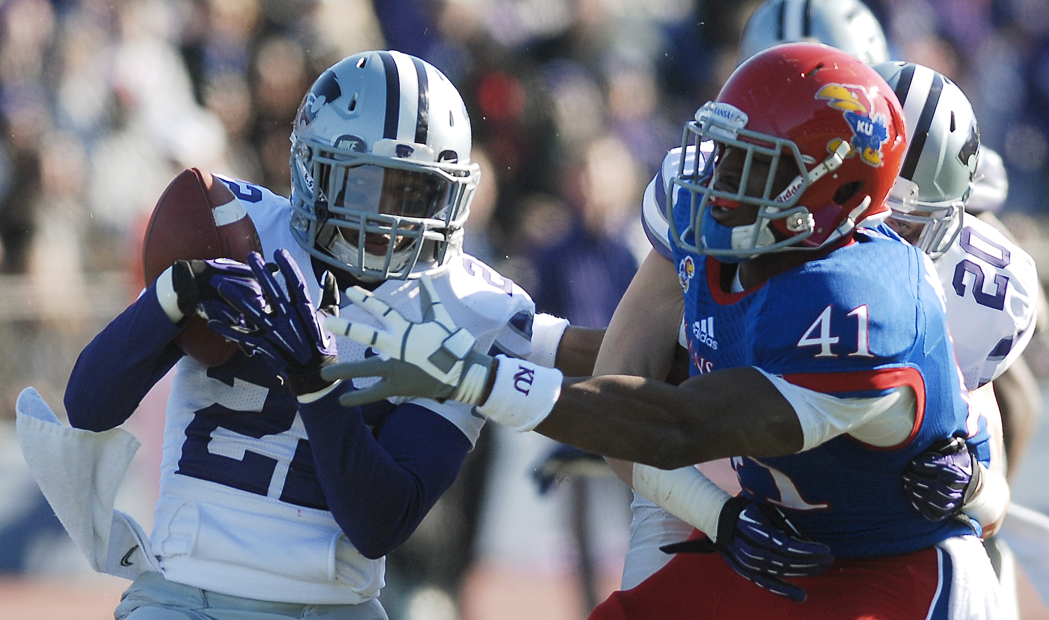 Kansas State defensive back Dante Barnett (22) pulls in an interception from Kansas receiver Jimmay Mundine (41) in the Jayhawks' 31-10 loss to the Kansas State Wildcats, Saturday at Memorial Stadium.
