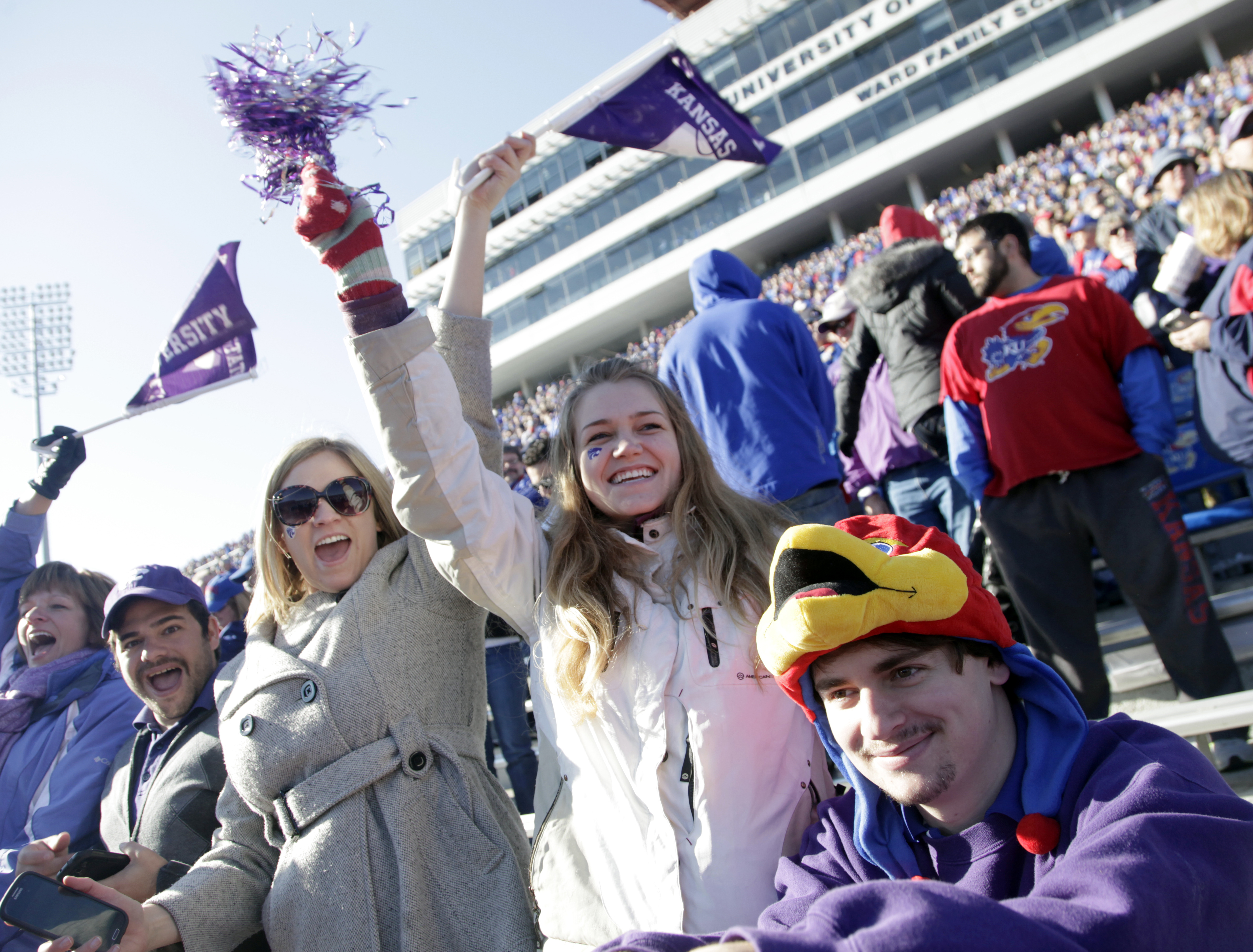 Kansas University junior Mike Regenstein, right, endures the cheering of his friends, all fans of the Kanas State Wildcats. To the left of Regenstein is his friend Monica Disberger, a KSU junior and to her left, her sister Kara Disberger, a KSU alum, both from Manhattan. The Jayhawks lost to the Wildcats 31-10 Saturday at Memorial Stadium.