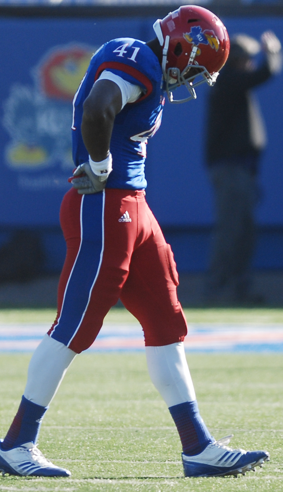 Jimmay Mundine (41) walks off the field after a Kansas State interception in the 2nd-half of the Jayhawks 31-10 loss to the Kansas State Wildcats Saturday at Memorial Stadium.