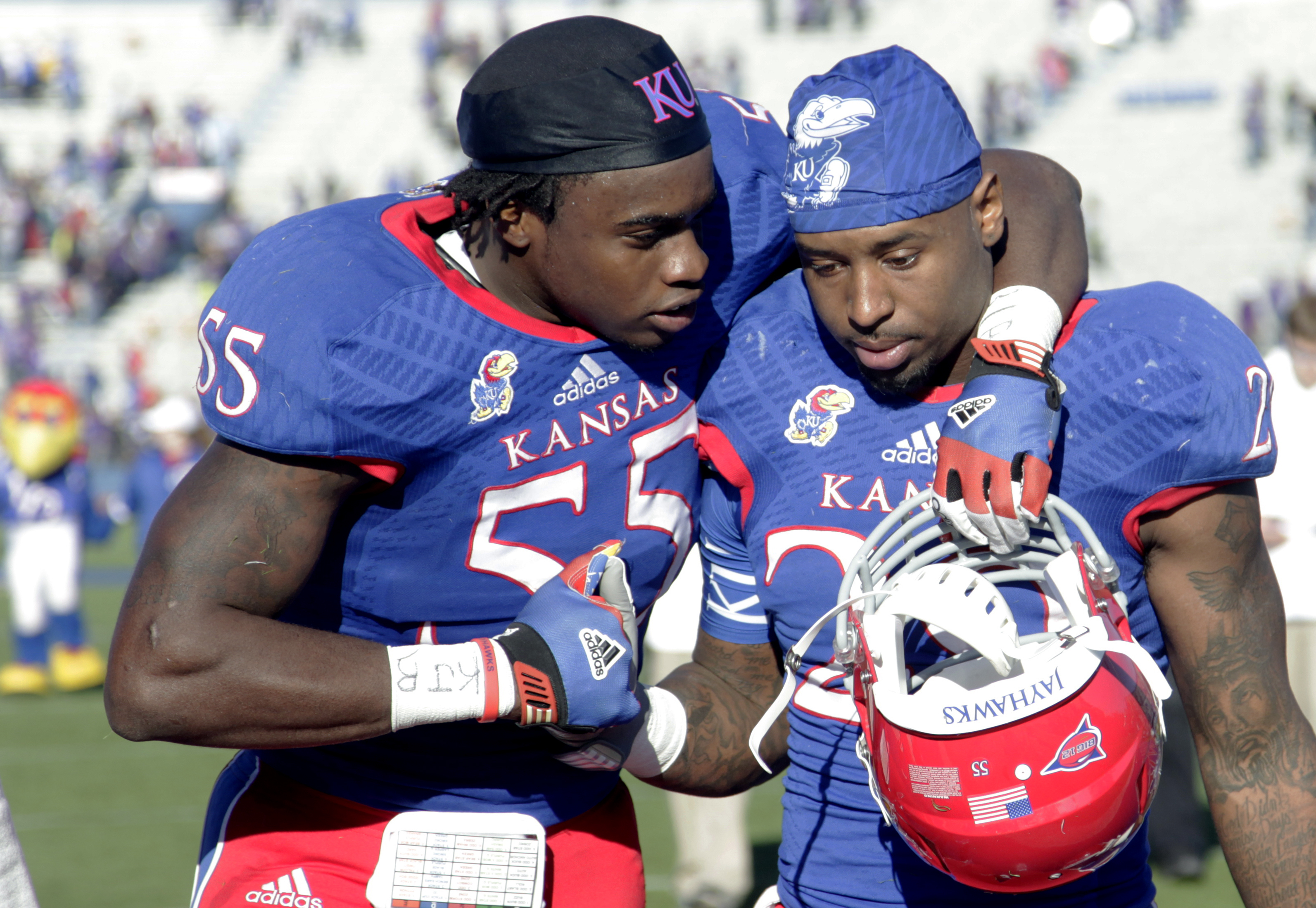 Kansas junior Michael Reynolds (55) walks off the field with senior James Sims (29) after Sims last game as a Jayhawk. KU lost 31-10 to the Kansas State Wildcats Saturday at Memorial Stadium.