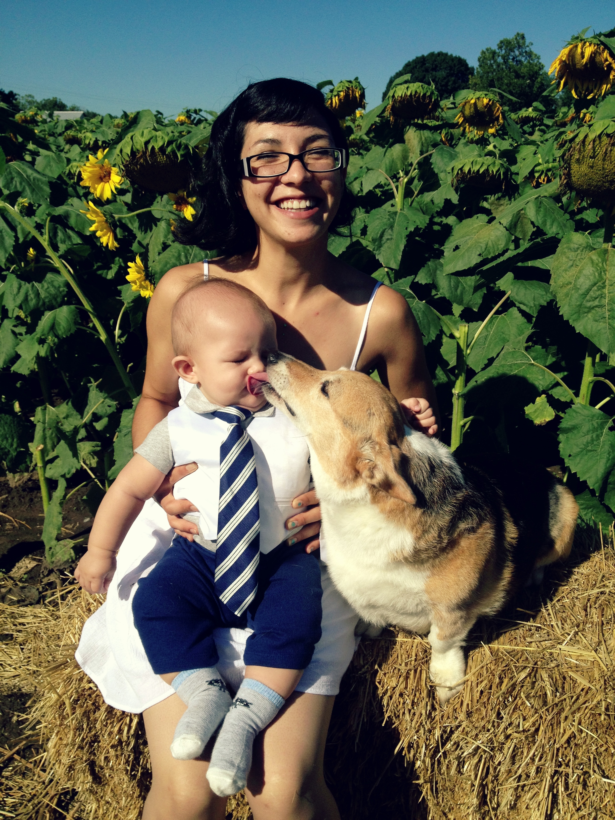 Tara Buhring, of Lawrence, her nephew Phillip Chenoweth, of Wichita, and Winnie the corgi pose for a family picture in a sunflower field between Lawrence and Tonganoxie on Sunday.