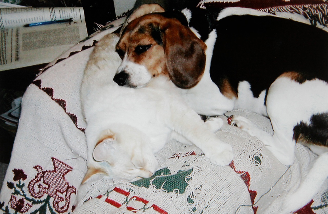Betsy (the Beagle) uses Freddie (the freeloader cat) as a pillow while they rest on Marilyn’s lap. Mike and Marilyn Amyx submitted the photo.